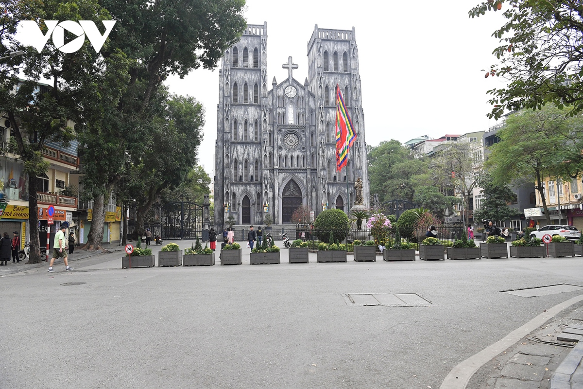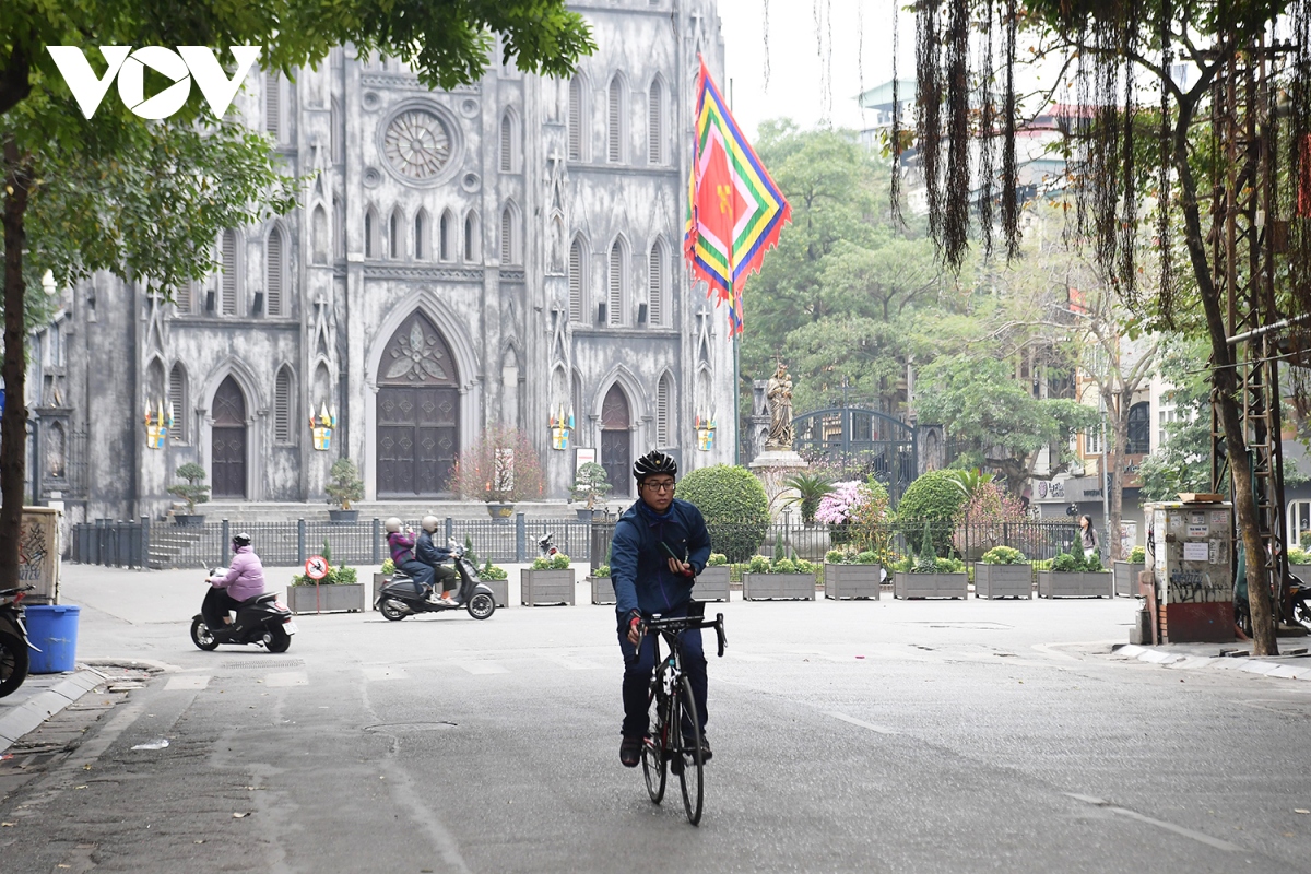 Khu vực Nhà thờ Lớn Hà Nội ngày thường rất đông người dân và du khách đến chụp ảnh, tham quan, sáng nay chỉ lác đác vài người đi xe đạp, xe máy. |