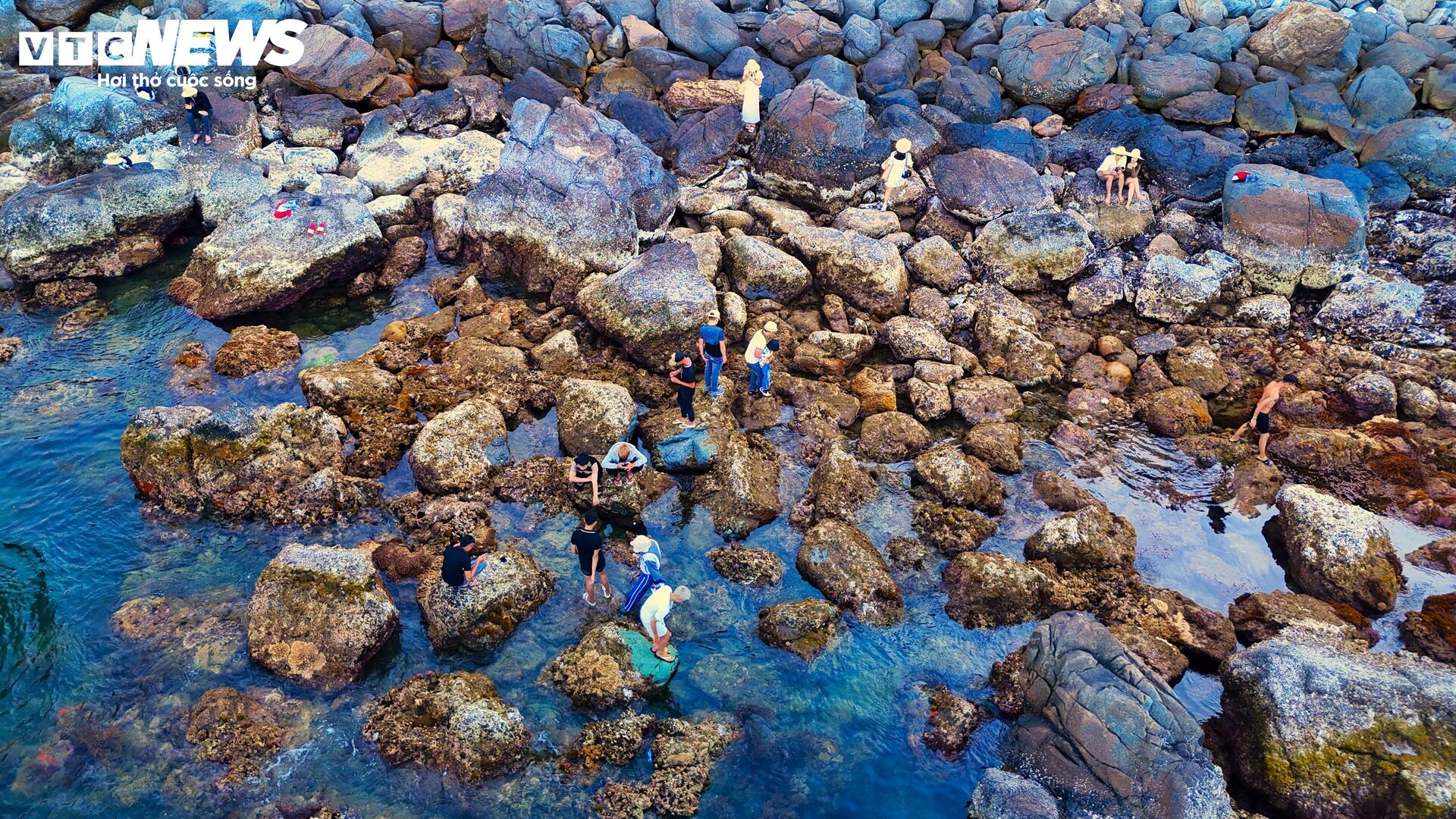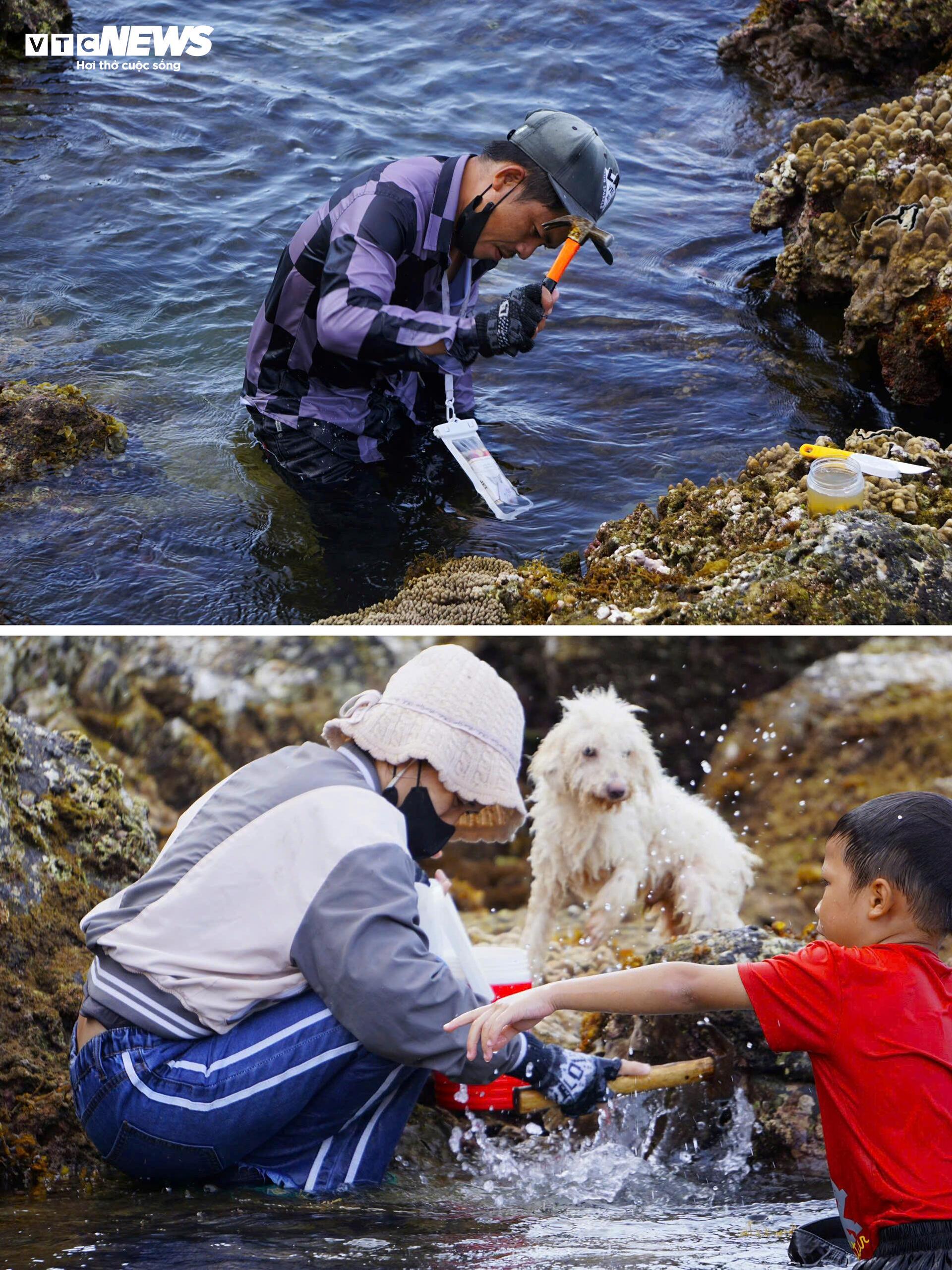 | Người dân địa phương và du khách tranh thủ thủy triều rút để kịp ngắm và chụp những chồi non san hô nhiều màu sắc với quan niệm mang lại nhiều may mắn và sức sống mãnh liệt trong năm mới. |