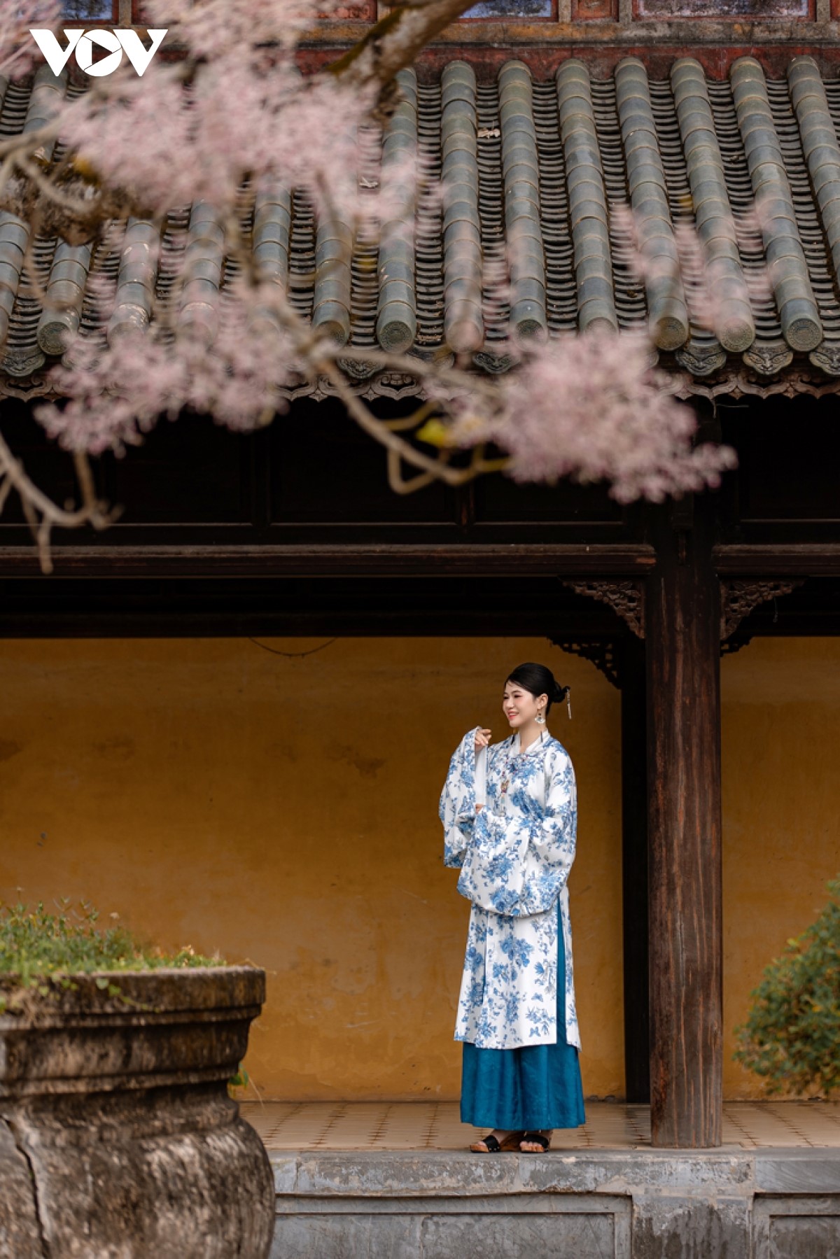 Các bạn trẻ với cổ phục Việt lưu lại khoảnh khắc đẹp bên loài hoa cung đình. |