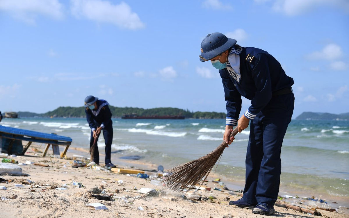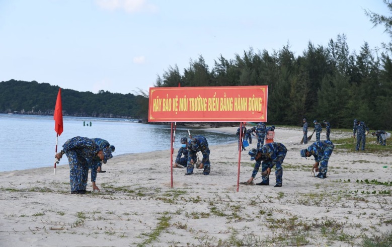 Cán bộ, chiến sĩ Vùng 5 Hải quét dọn rác thải bờ biển. Ảnh: baotainguyenmoitruong.vn |