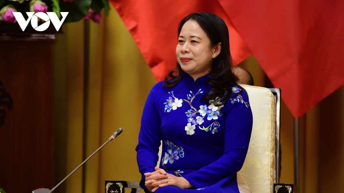 Phó Chủ tịch nước Võ Thị Ánh Xuân giới thiệu các đại biểu tham gia lễ đón phía Việt Nam. |