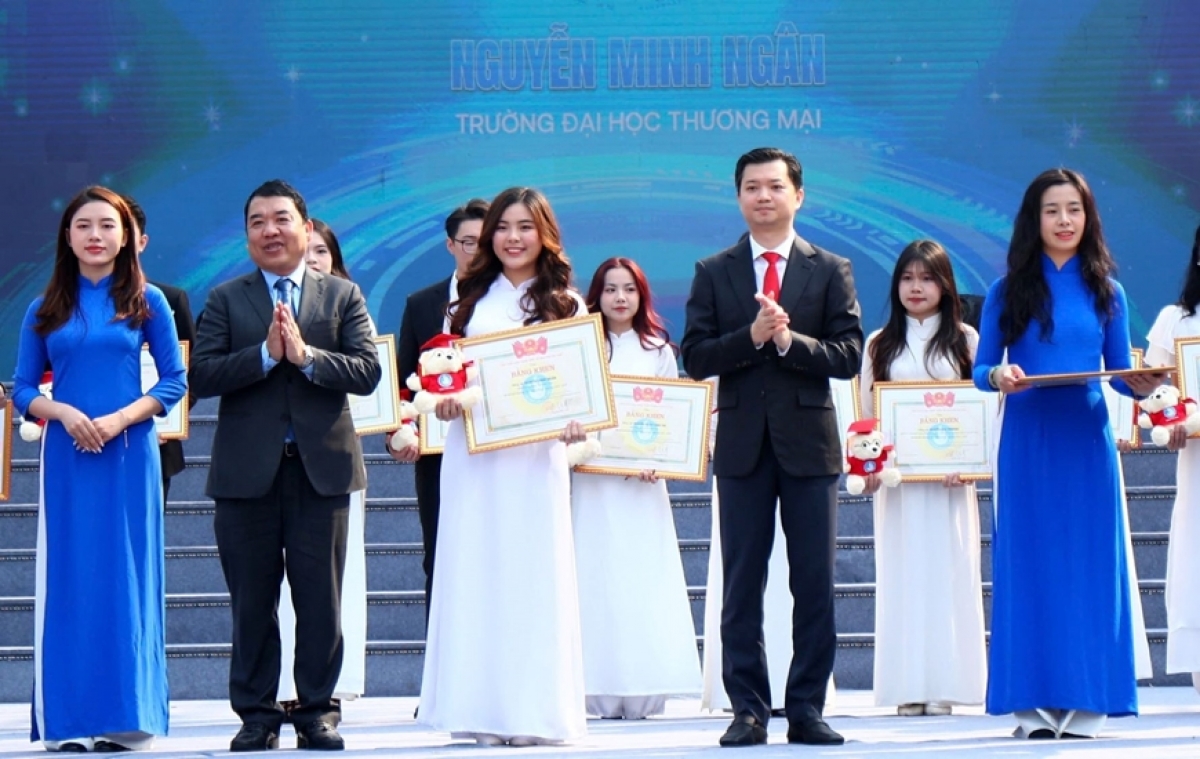 | Bí thư Trung ương Đoàn, Chủ tịch Trung ương Hội Sinh viên Việt Nam Nguyễn Minh Triết và Phó Trưởng ban Tuyên giáo Thành ủy Hà Nội Đào Xuân Dũng trao danh hiệu "Sinh viên 5 tốt" cấp Trung ương |
