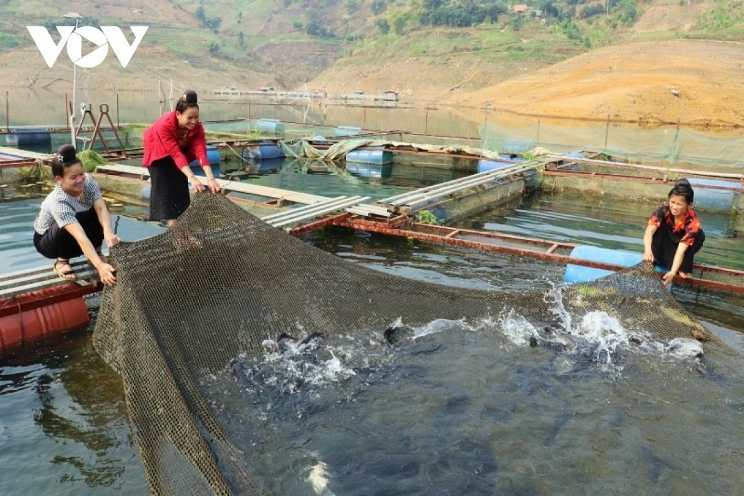 Khi công trình Nhà máy thủy điện Sơn La hoàn thành, đã tạo ra vùng lòng hồ rộng lớn với hơn 25.000 ha. Khai thác lợi thế này, người dân tại huyện Quỳnh Nhai, tỉnh Sơn La đã phát triển chăn nuôi các loại cá lồng thương phẩm. Ảnh: VOV |