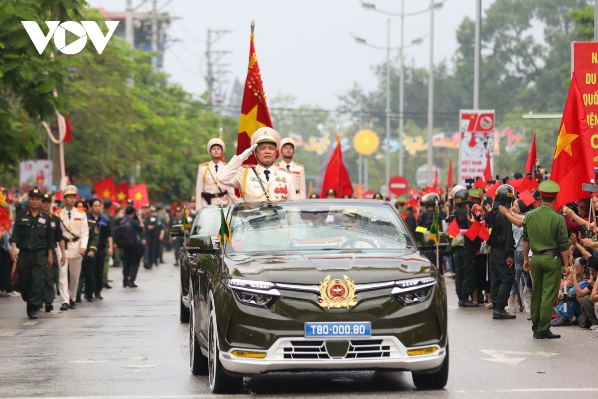 Thiếu tướng Lê Văn Hà dẫn đầu đoàn diễu binh của lực lượng Công an nghiêm trang chào nhân dân. |