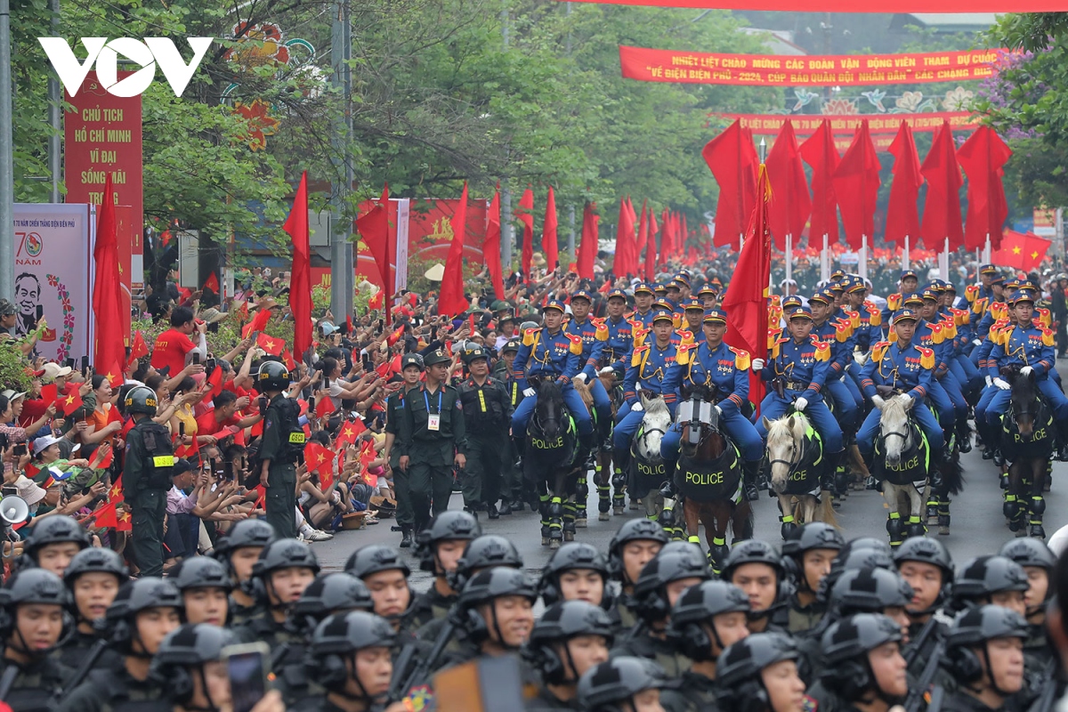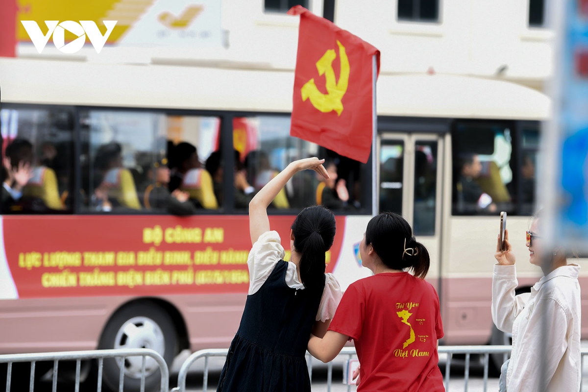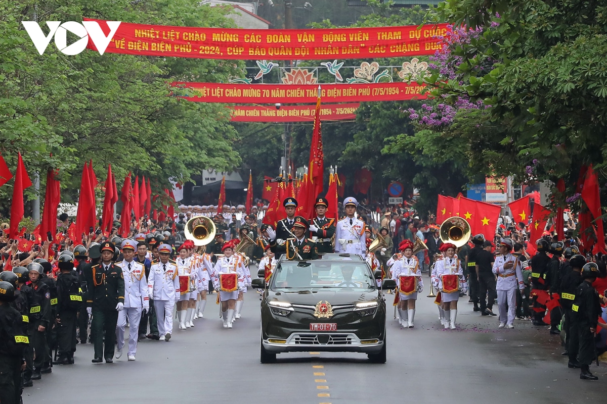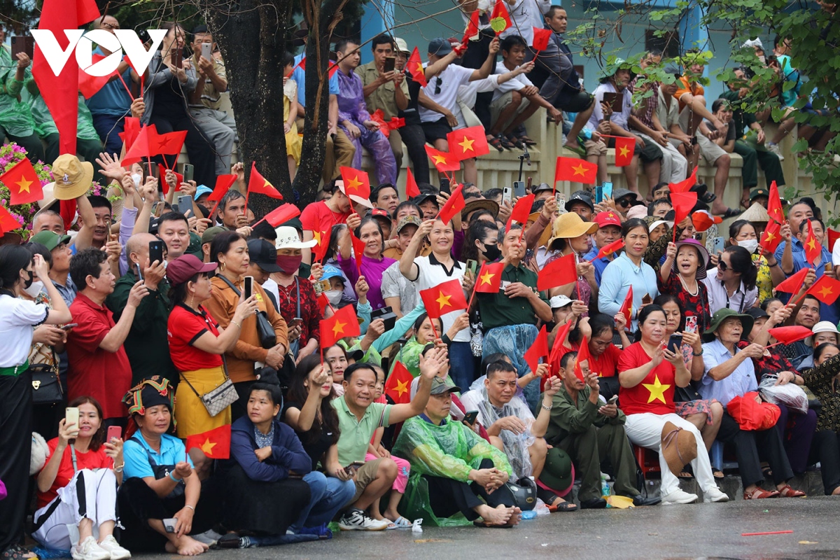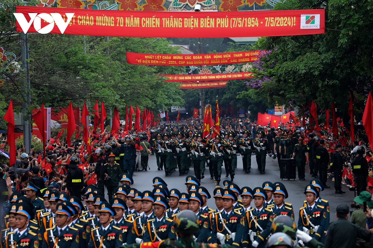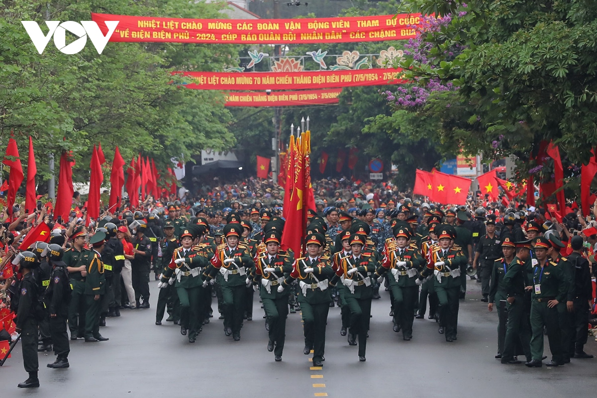 Các con phố chính của Điện Biên Phủ chật kín người với cờ hoa bất chấp những cơn mưa nặng hạt. Người dân đã đổ về xếp hàng từ tờ mờ sáng 7/5 để đón chào các khối diễu binh, diễu hành. |