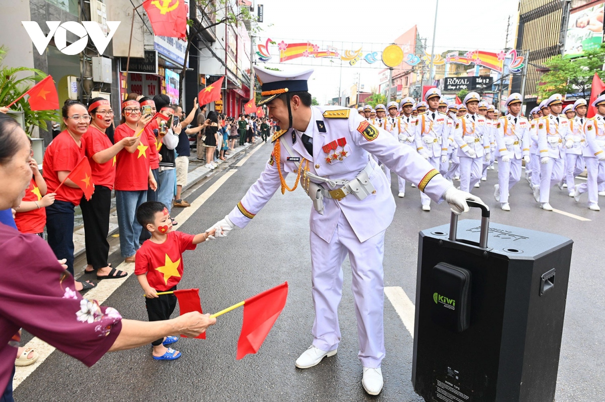 Thượng tướng Nguyễn Trọng Bình trên xe chỉ huy vẫy tay chào nhân dân, đằng sau là khối quân nhạc nữ. |