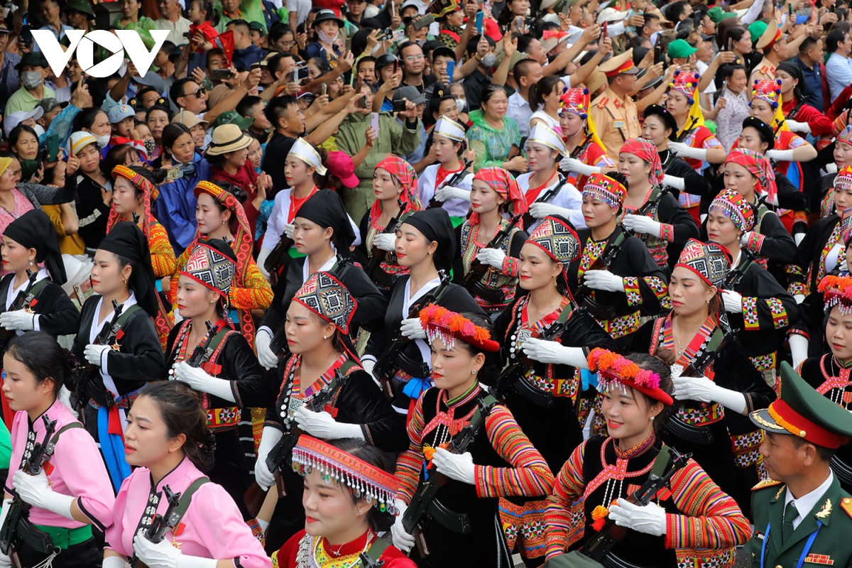 Các nữ du kích các dân tộc vùng Tây Bắc chắc tay súng diễu hành. |