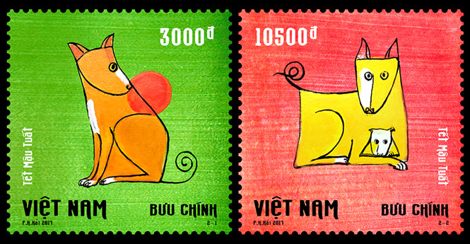 Mẫu 1 có giá mặt 3.000 đồng, thể hiện hình ảnh chó bố trên nền màu xanh, mẫu 2 có giá mặt 10.500 đồng, thể hiện hình ảnh tình mẫu tử - chó mẹ ôm chó con trên nền màu đỏ hồng.