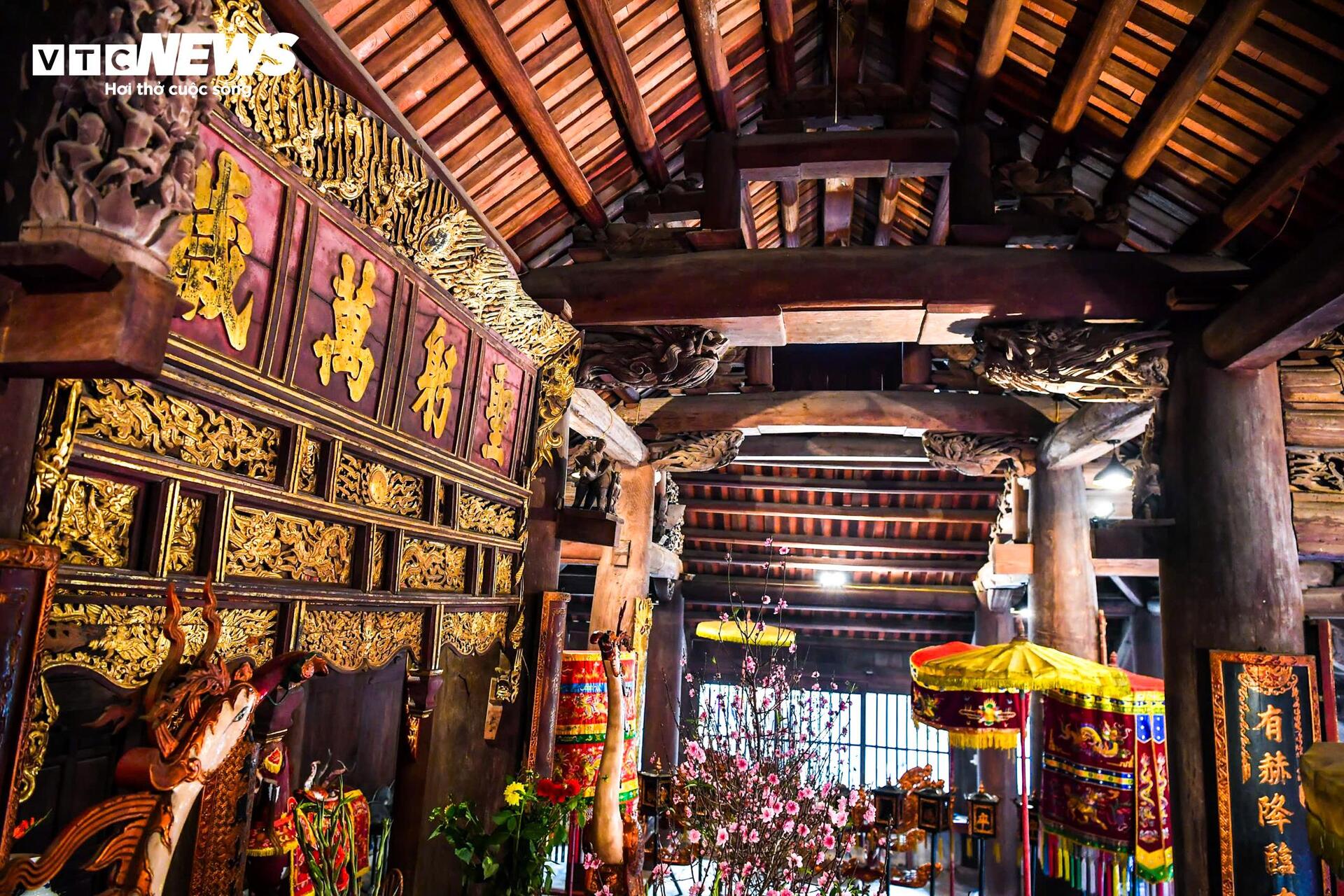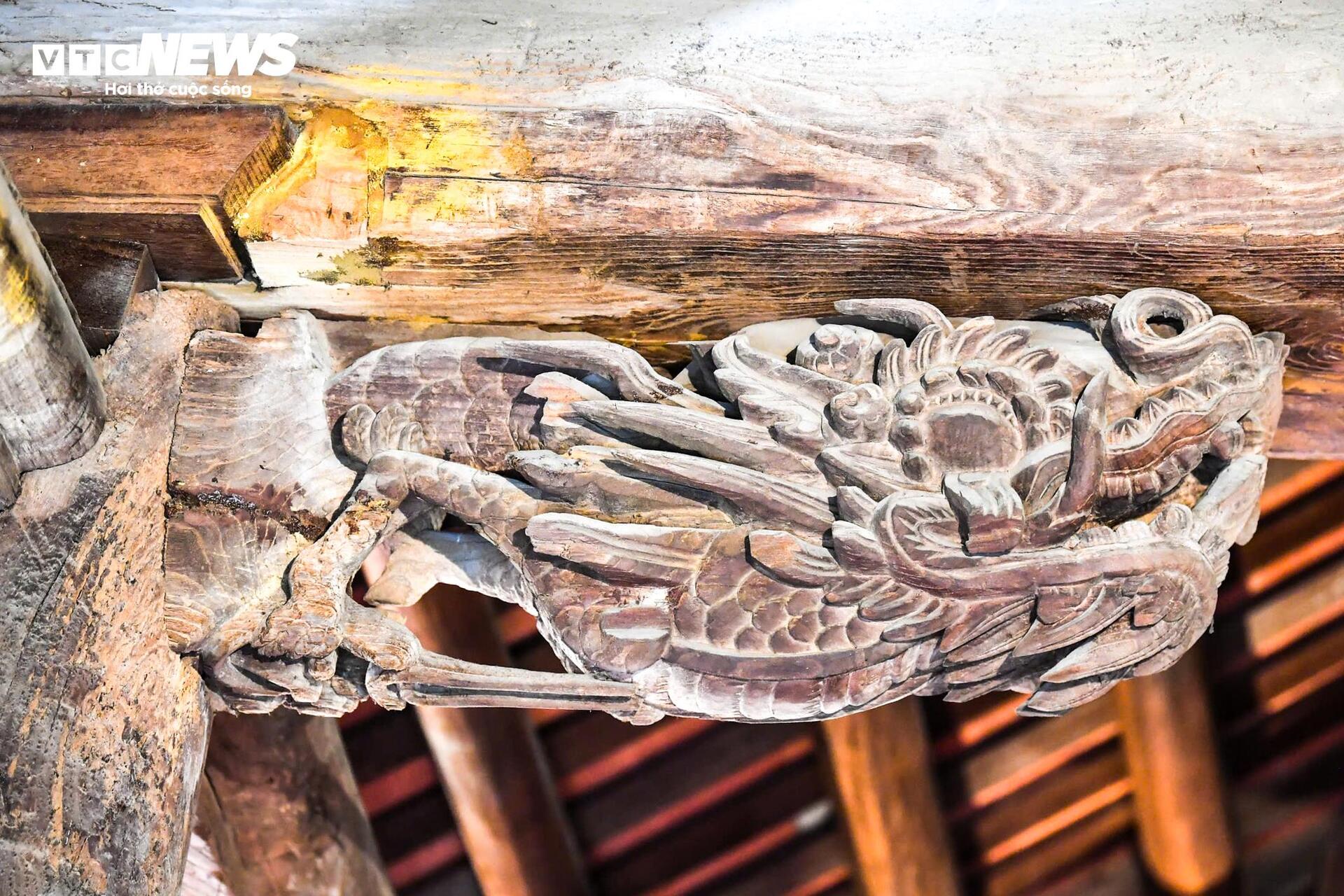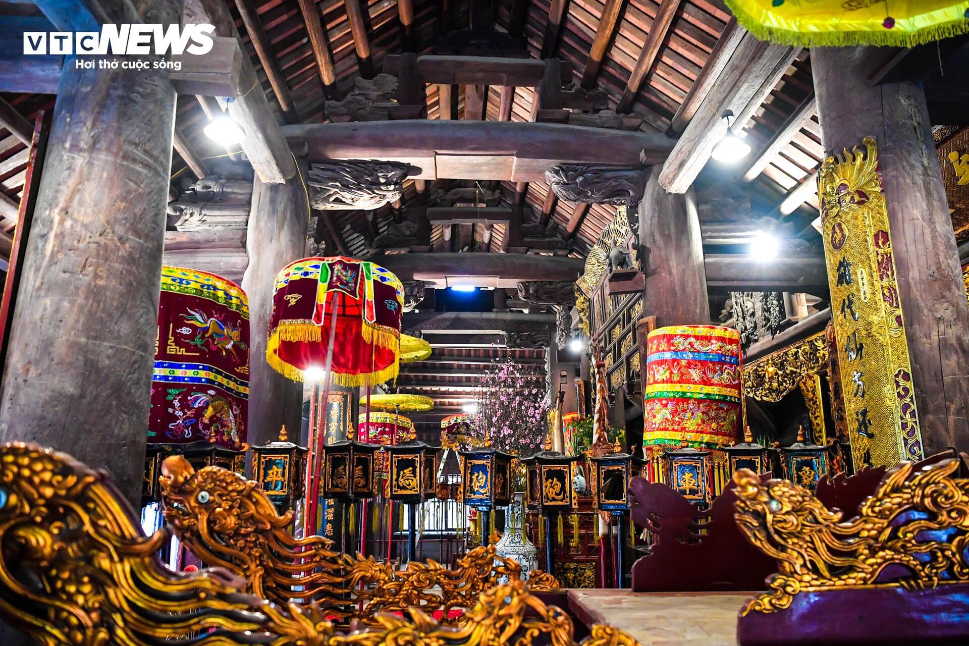 Toàn bộ cấu kiện nguyên thủy được làm bằng gỗ xoan, kết cấu theo kiểu “chồng giường - giá chiêng - hạ kẻ” với 64 cột lớn, đường kính cột lớn nhất trên 0,6 m. |