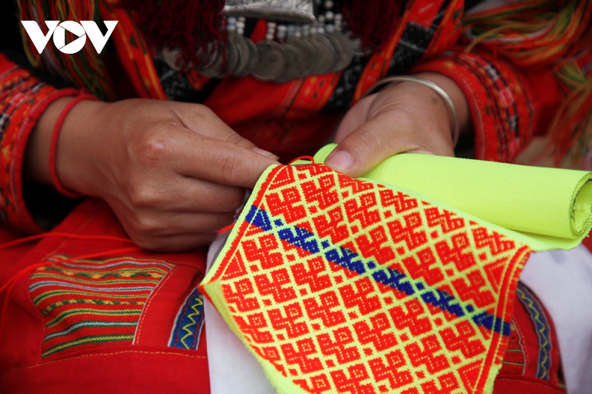 Để có họa tiết trên vải, người phụ nữ Pà Thẻn phải tỉ mẩn, khéo léo khâu bằng tay. |