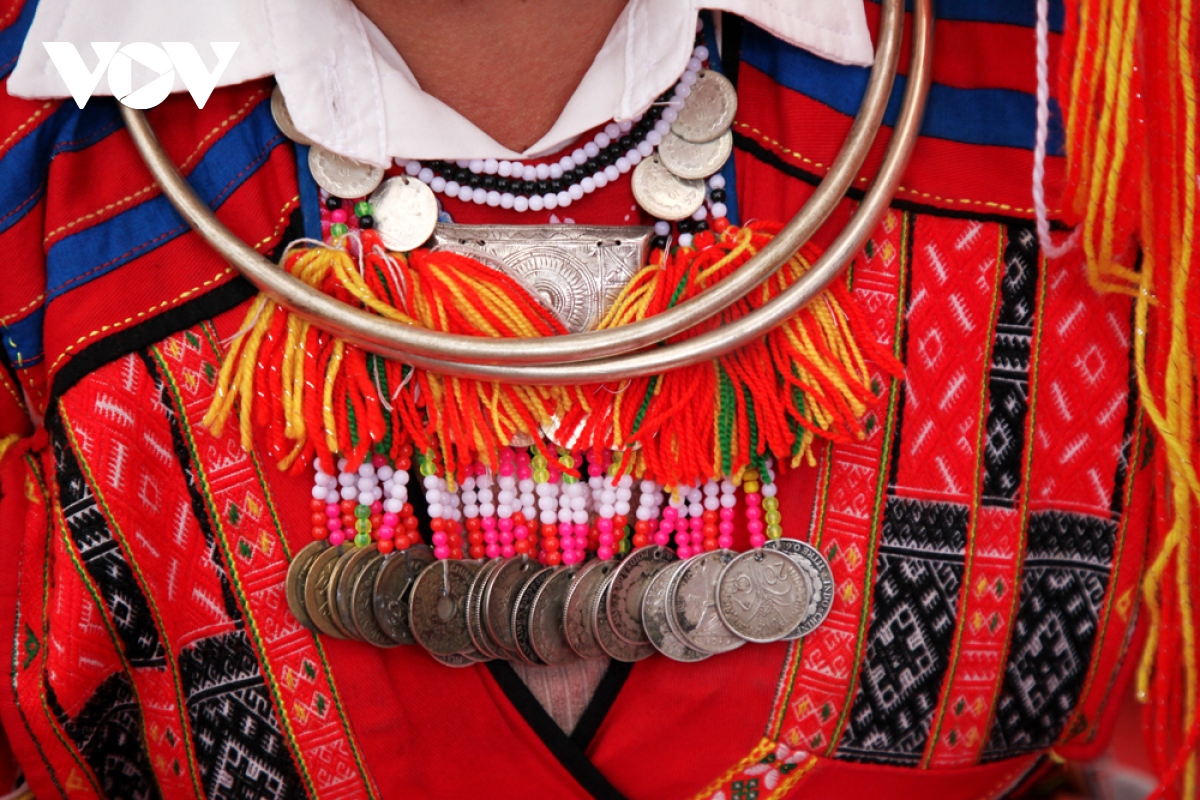 Màu trắng của vòng cổ bạc, điểm xuyết hàng đồng xu bạc càng làm nổi bật hoa văn trên áo của người phụ nữ. |