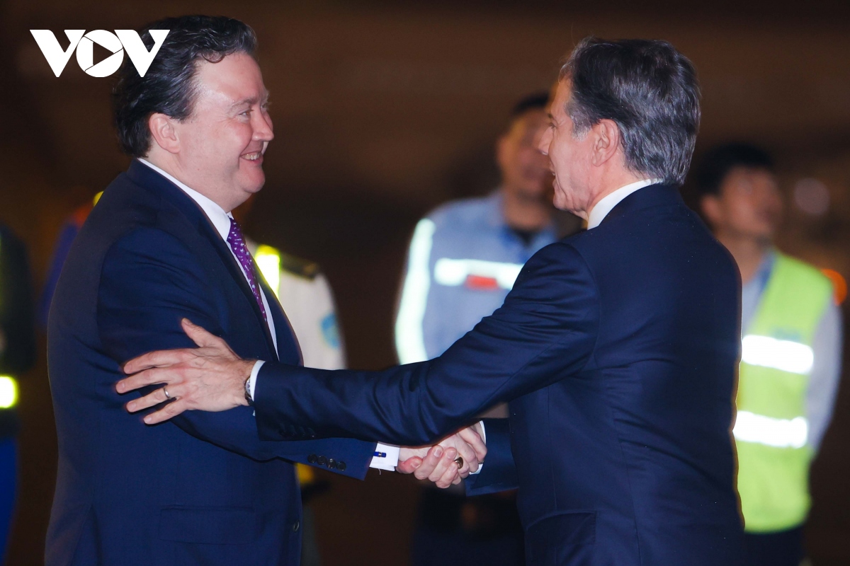Đại sứ Mỹ tại Việt Nam Marc Knapper đón Ngoại trưởng Blinken tại sân bay. |
