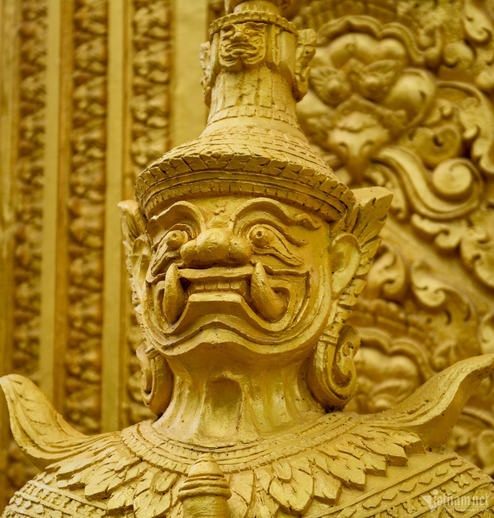 Cận cảnh hình tượng các chinh thần (Krud) tại chùa Âng với lối điêu khắc mang đậm dấu ấn văn hóa cổ truyền Khmer. |