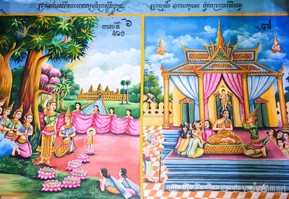 Tường và trần chánh điện là những bức bích họa lớn, thể hiện cuộc đời của Phật Thích Ca từ lúc đản sanh đến khi nhập Niết Bàn. |
