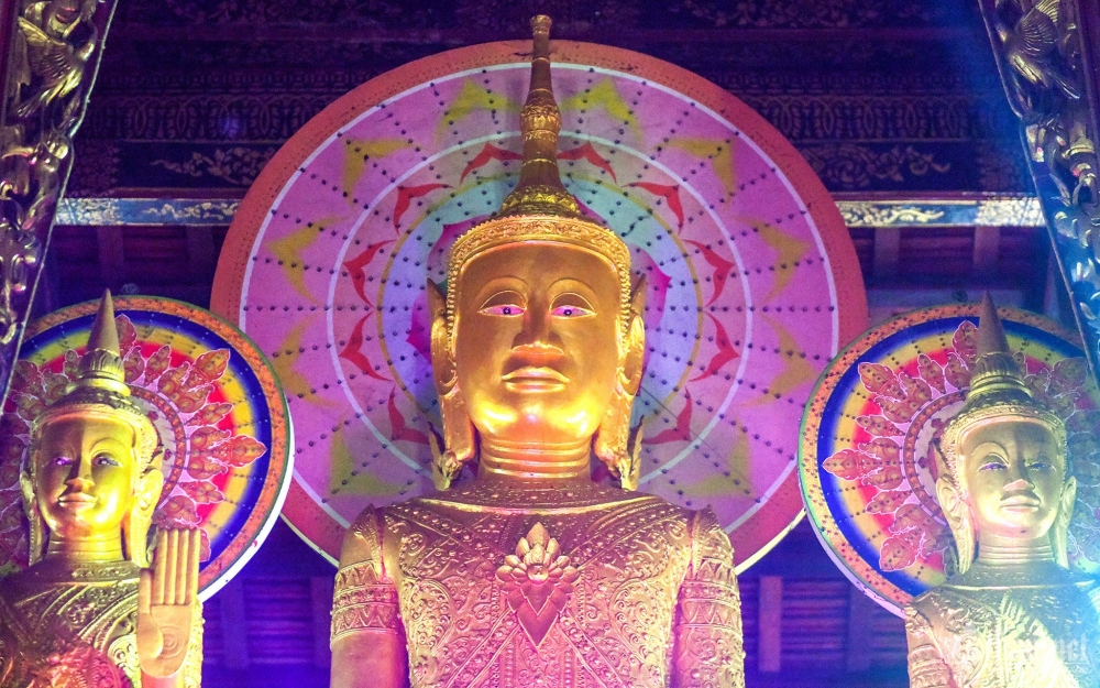 Tượng phật lớn cao 2,1m đặt giữa chính điện, xung quanh có 55 tượng phật lớn nhỏ khác nhau được tạo hình bằng chất liệu xi măng và gỗ quý. |