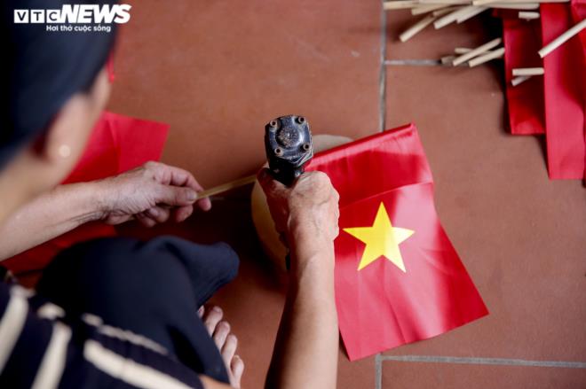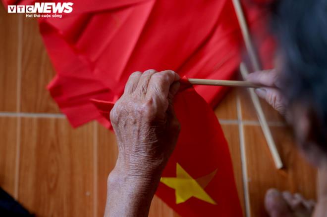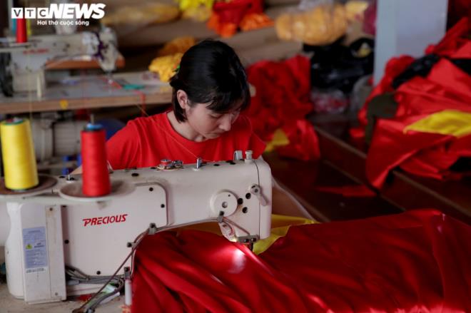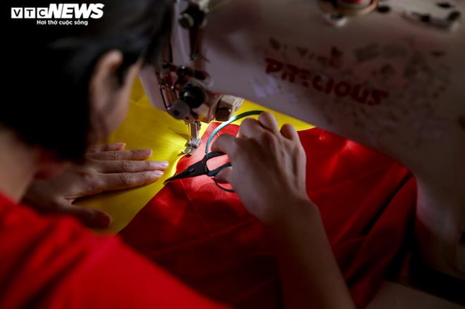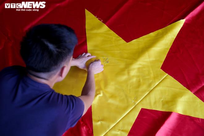 | Sau khi được cắt khuôn, in lưới, ép nhiệt, lá cờ đỏ sao vàng được người làm lắp vào cán cờ. |