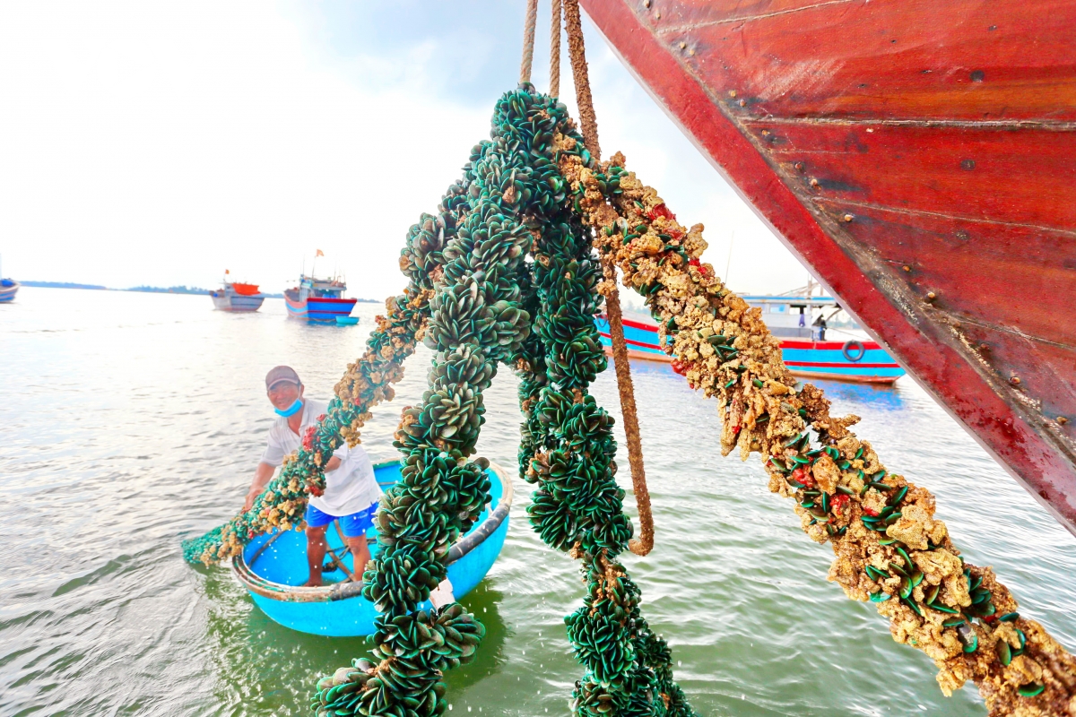 Các ngư dân bắt vẹm để làm nguồn thức ăn vừa để vệ sinh dây neo