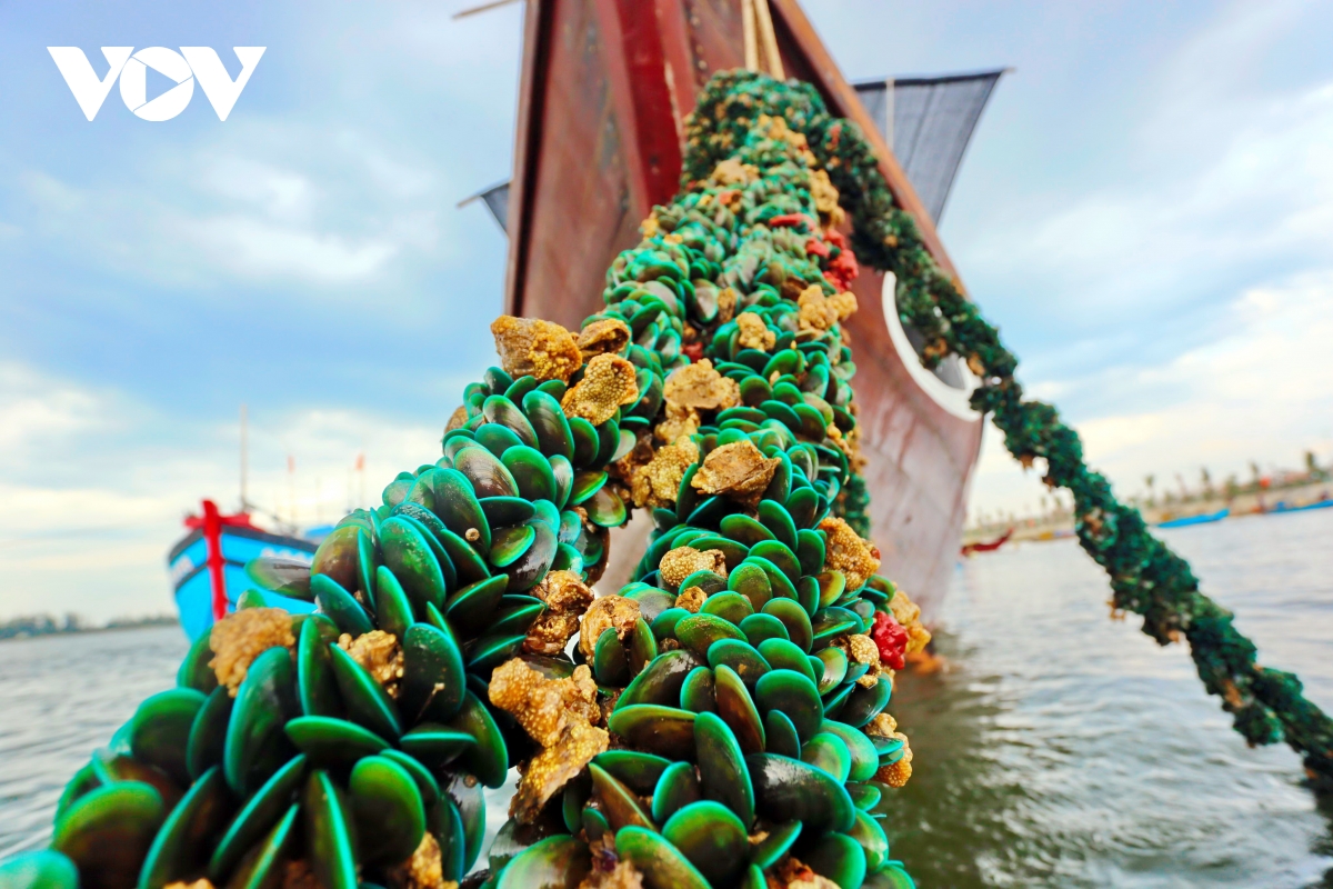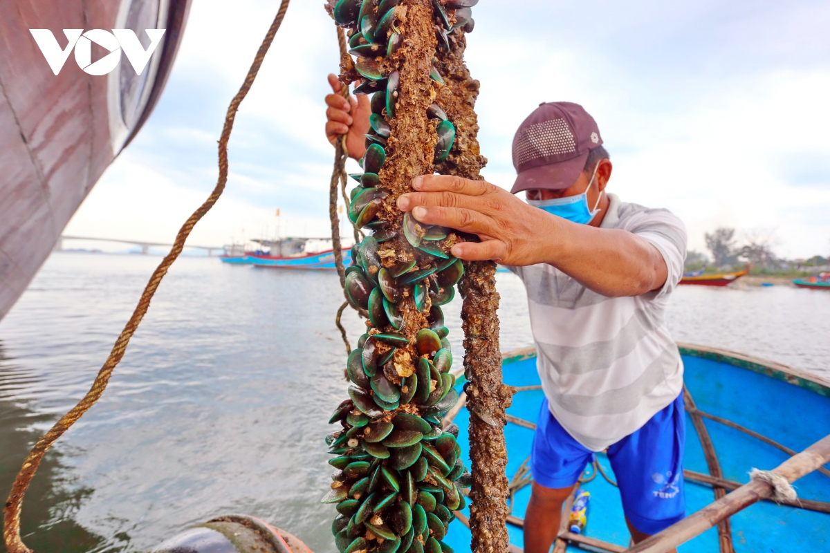 Theo ngư dân xã Duy Nghĩa, sau Tết Nguyên Đán, vẹm xanh bắt đầu sinh sản và bám vào các dây neo tàu, dây rớ đánh cá trên sông Thu Bồn