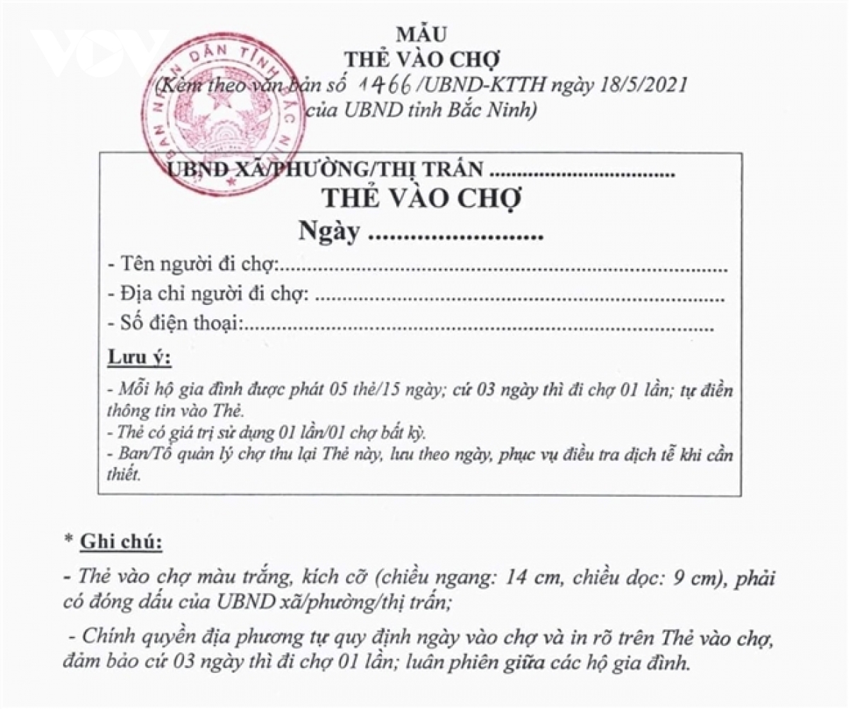 Theo Sở Công Thương Bắc Ninh, từ chiều 18/5, huyện Thuận Thành và TP Bắc Ninh đang cách ly xã hội theo Chỉ thị 16, mỗi hộ gia đình cứ 3 ngày được đi chợ một lần, mỗi hộ được phát 5 thẻ vào chợ trong 15 ngày, trên đó ghi rõ ngày, tên, địa chỉ, số điện thoại của người đi chợ. Thẻ có giá trị sử dụng một lần cho một lượt.