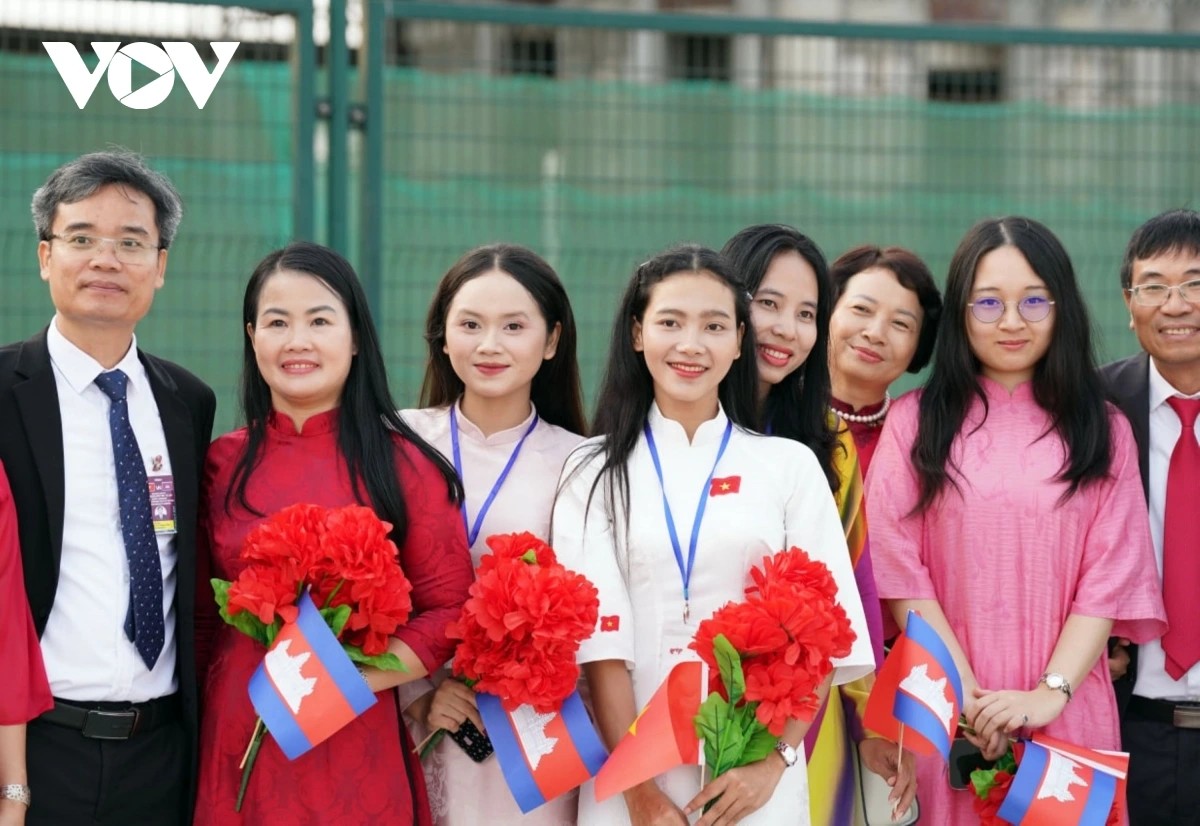 Các cháu thiếu nhi là thế hệ con cháu người Việt Nam sinh sống tại Campuchia chào đón đoàn.