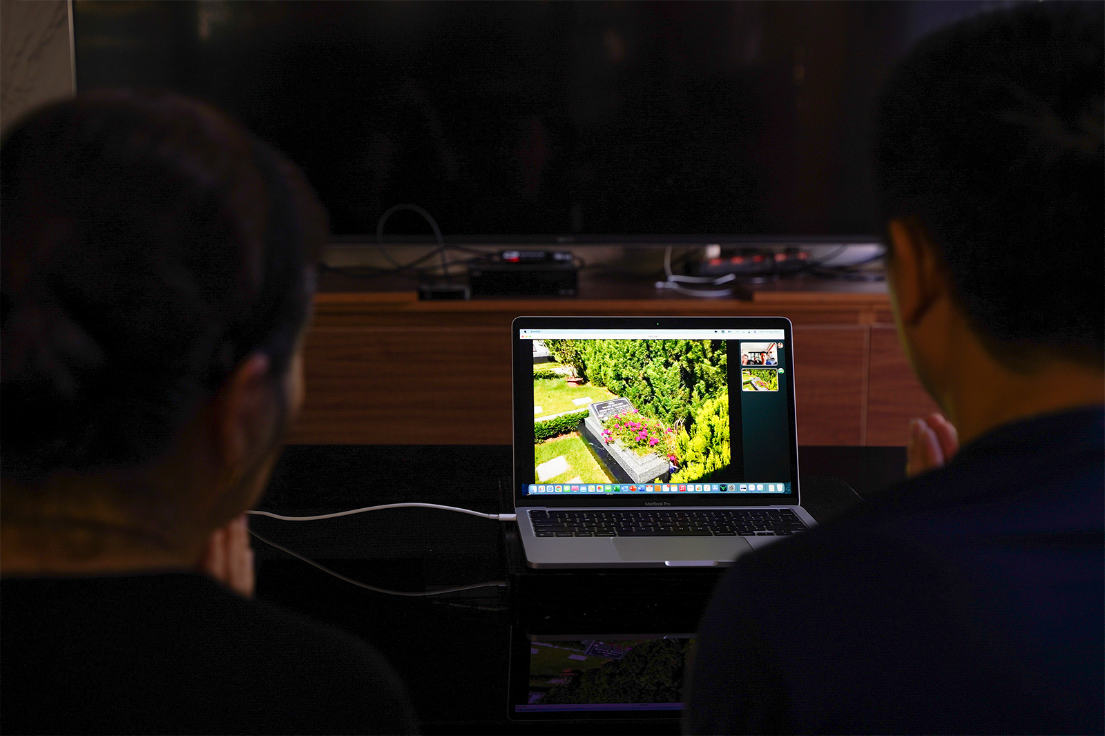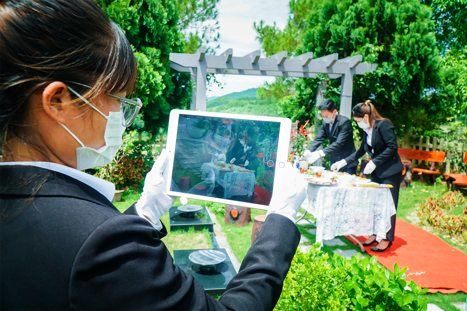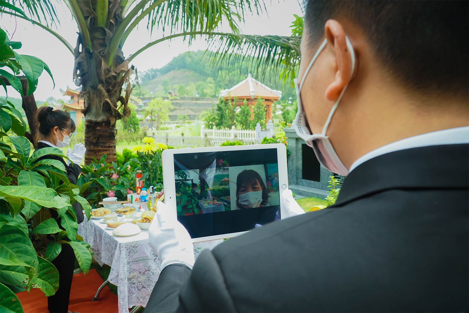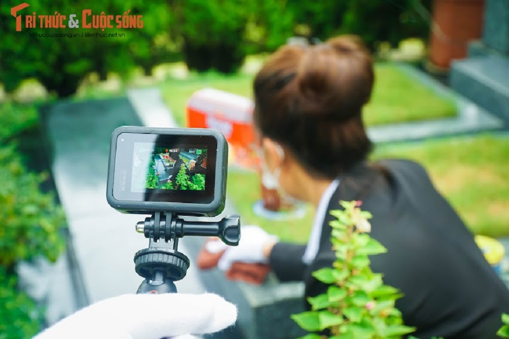 Ở bên phần mộ gia tiên, các nhân viên trong trang phục gọn gàng, trang nghiêm mở màn hình thiết bị hỗ trợ quay, trực tiếp cho gia đình bà Liên xem quá trình các nhân viên dọn dẹp, làm lễ. Ảnh: Báo Dân Việt