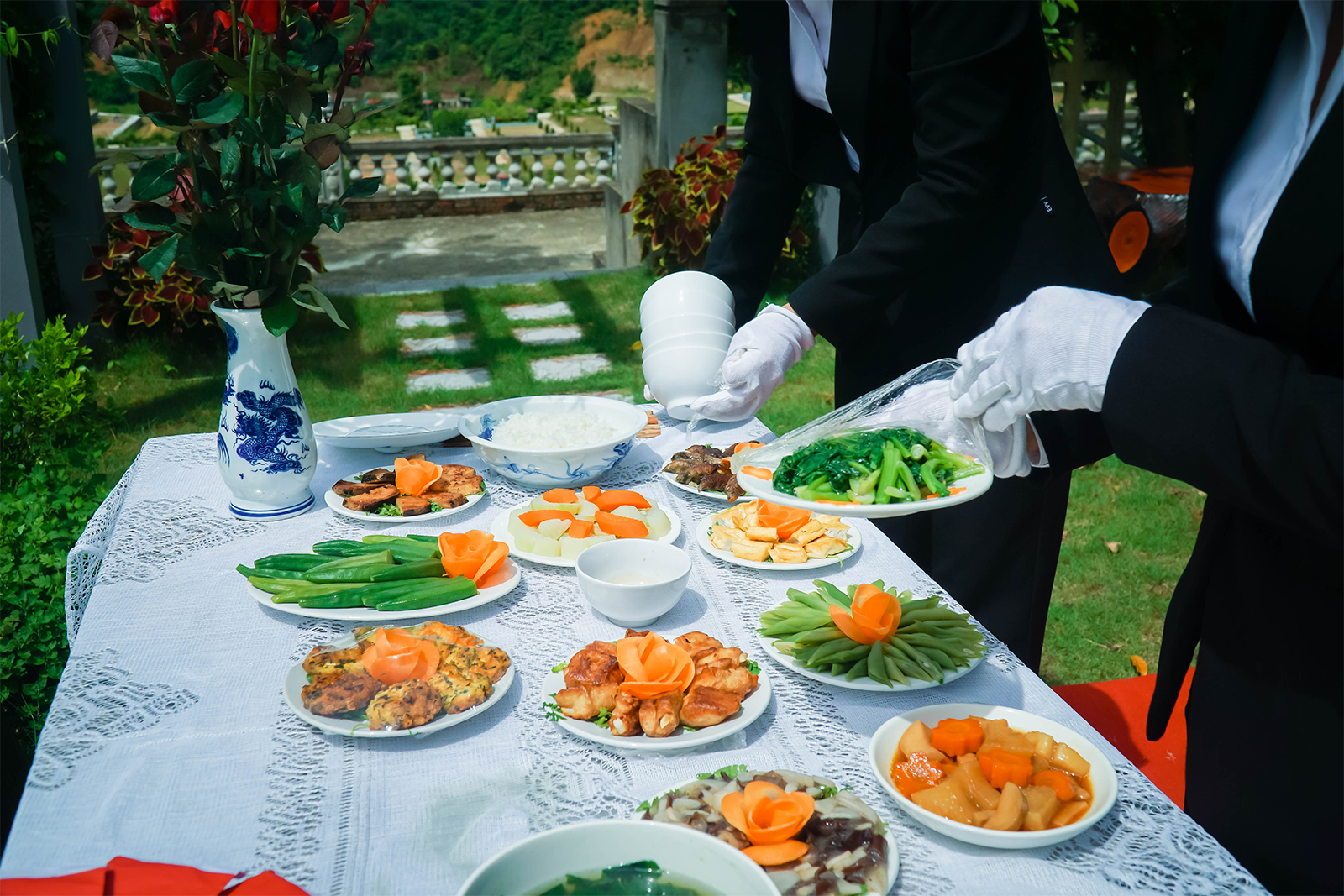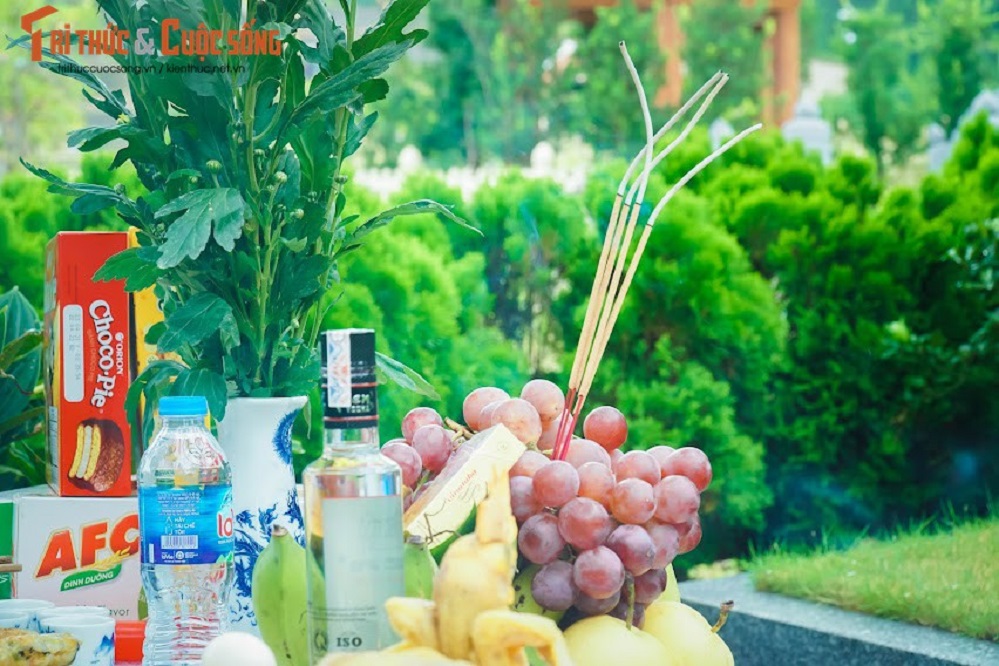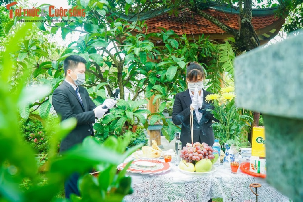 Đại diện Công viên Lạc Hồng Viên (Hòa Bình) cho biết mâm cỗ cúng online được chuẩn bị và bày biện rất kĩ càng để những gia đình ở xa yên tâm khi không thể tới thăm phần mộ gia tiên vì dịch COVID – 19. Toàn bộ quá trình dọn dẹp khuôn viên phần mộ, chuẩn bị mâm cỗ... đều được nhân viên chụp ảnh, quay video để gửi nghiệm thu cho gia chủ. Ảnh: Báo Dân Việt.