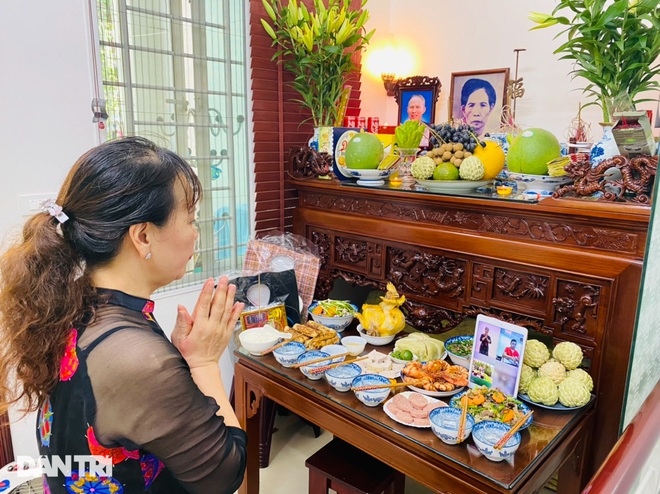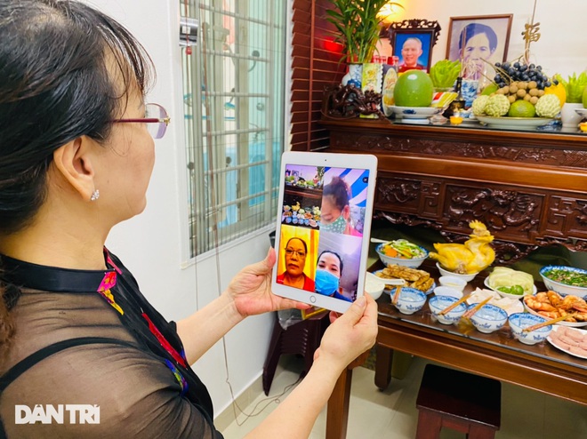 Bà Hồng sửa soạn mâm cỗ cúng gia tiên trong dịp Đại lễ Vu Lan, chia sẻ hình ảnh cùng nhiều người thân trong họ hàng do họ không thể tới dự trực tiếp. Ảnh: Báo Dân Trí