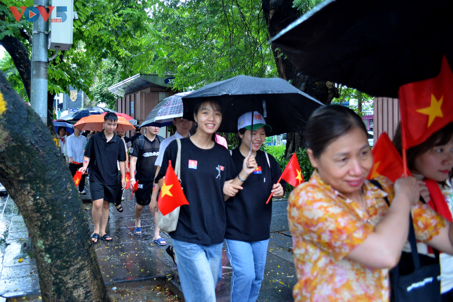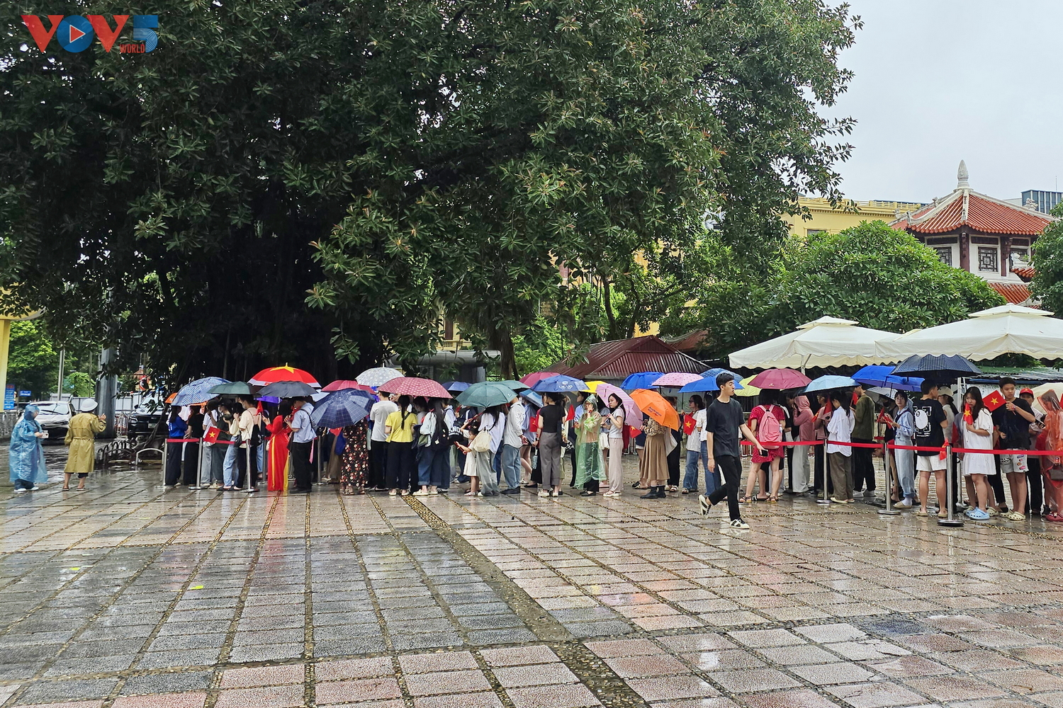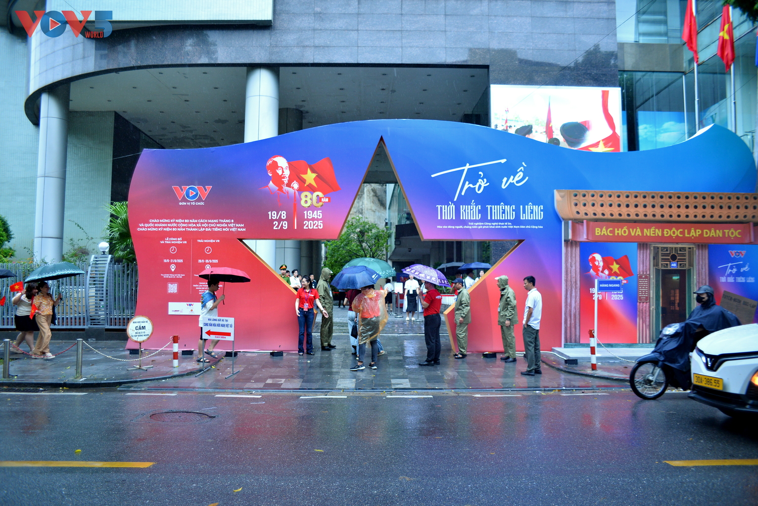| Sáng 19/8, không khí trước Cung Văn hóa Lao động Hữu nghị Việt - Xô (Hà Nội) đã trở nên náo nhiệt từ tờ mờ sáng. Dù 8h chương trình trải nghiệm thực tế ảo “Trở về khoảnh khắc thiêng liêng” mới chính thức khai mạc, hàng nghìn người dân đã có mặt từ sớm, kiên nhẫn xếp hàng dài trong mưa để chờ tới lượt vào cửa. |