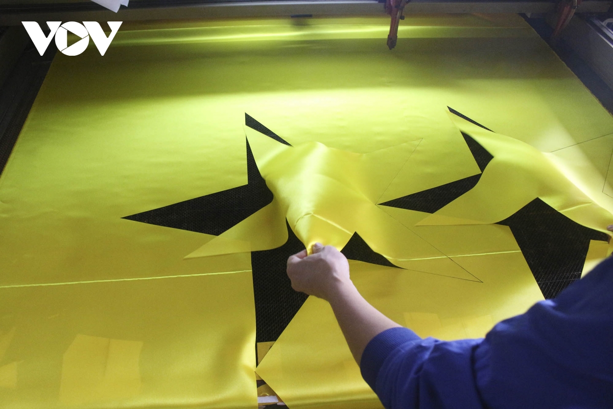 Để làm ra lá cờ hoàn chỉnh cần có nhiều công đoạn như may nhiều lớp, may viền, may mặt, đo chính xác, lấy phấn đánh dấu rồi đặt ngôi sao và lấy ghim để giữ... Trong đó, bước quan trọng là ghép ngôi sao vào cờ, làm sao để ngôi sao luôn đặt ở vị trí trọng tâm chính xác. |