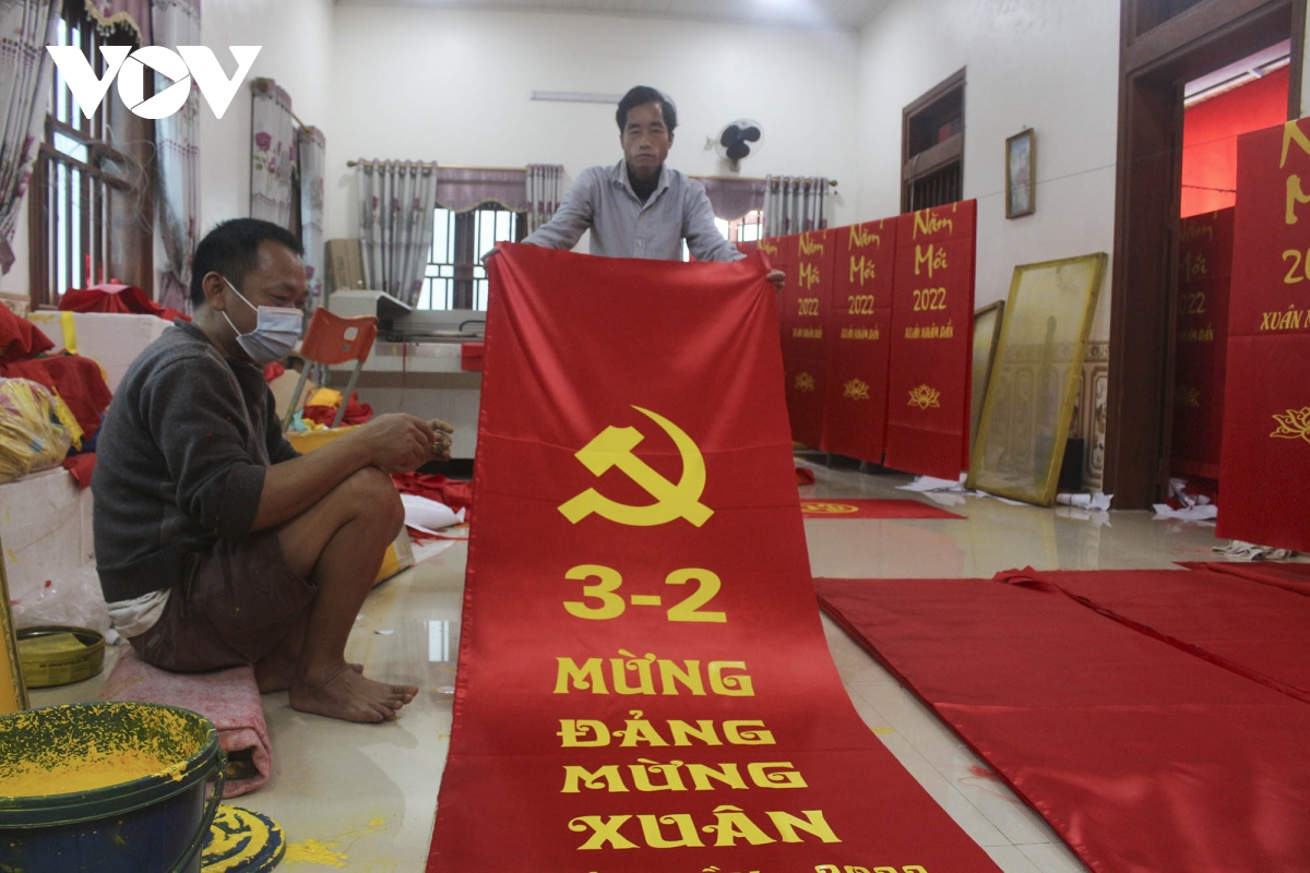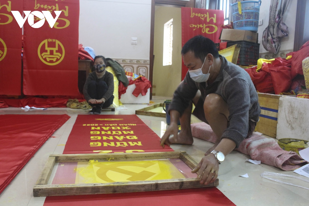 Anh Đặng Hồng Hưởng cho biết: “Năm nay so với năm ngoái số lượng hàng hóa cũng giảm đi nhiều kể cả băng rôn, khẩu hiệu. Gia đình vừa nhận đơn khai xuân đầu tiên với khoảng 1.000 baner. Mấy hôm nay toàn làm việc tới 3 rưỡi sáng để kịp xuất hàng cho khách”. |