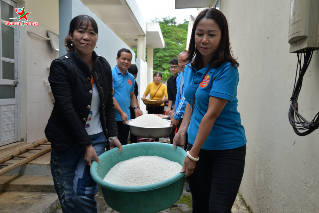 Mọi người cùng nhau rửa lá dong, vo gạo, đãi đỗ, chẻ lạt, rồi gói bánh... Mỗi người làm việc với tình cảm và sự sẻ chia sâu sắc, trên tinh thần khẩn trương, với mong muốn làm sao những chiếc bánh chưng sớm được gửi đến tay đồng bào miền Trung đang chật vật gồng mình chống lũ, giúp đồng bào sớm vượt qua khó khăn trước mắt.