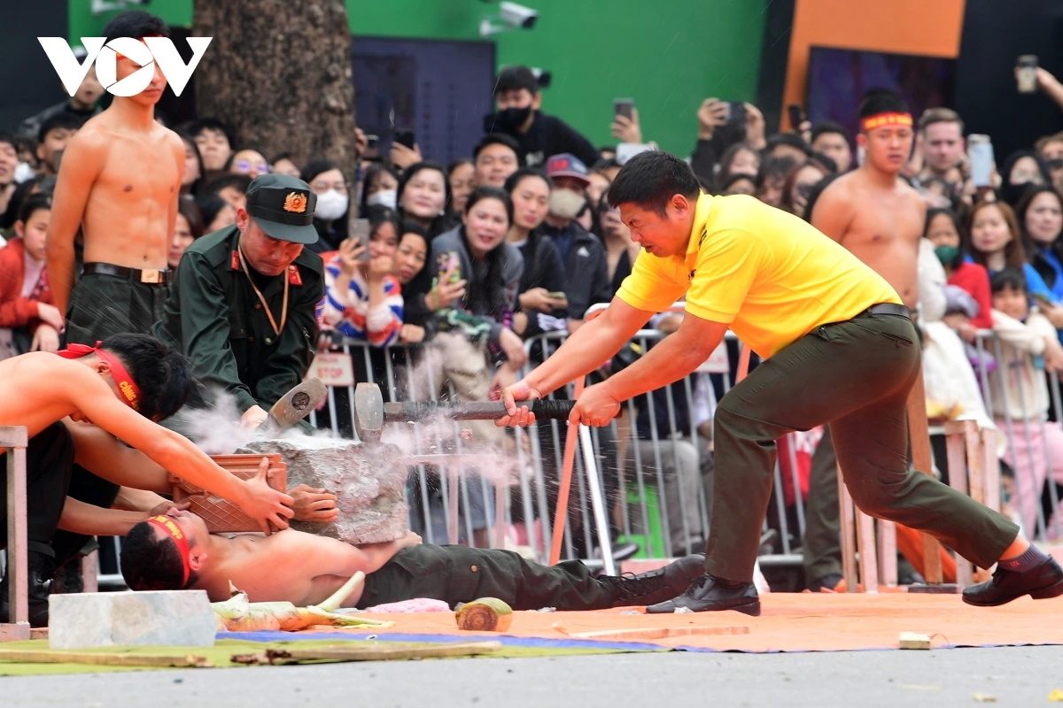 | Chiến sĩ cảnh sát nằm trên bàn chông, đặt đá lên ngực và chống chọi hàng chục cú đập búa xuống phiến đá suốt vài phút. Ảnh: VOV |
