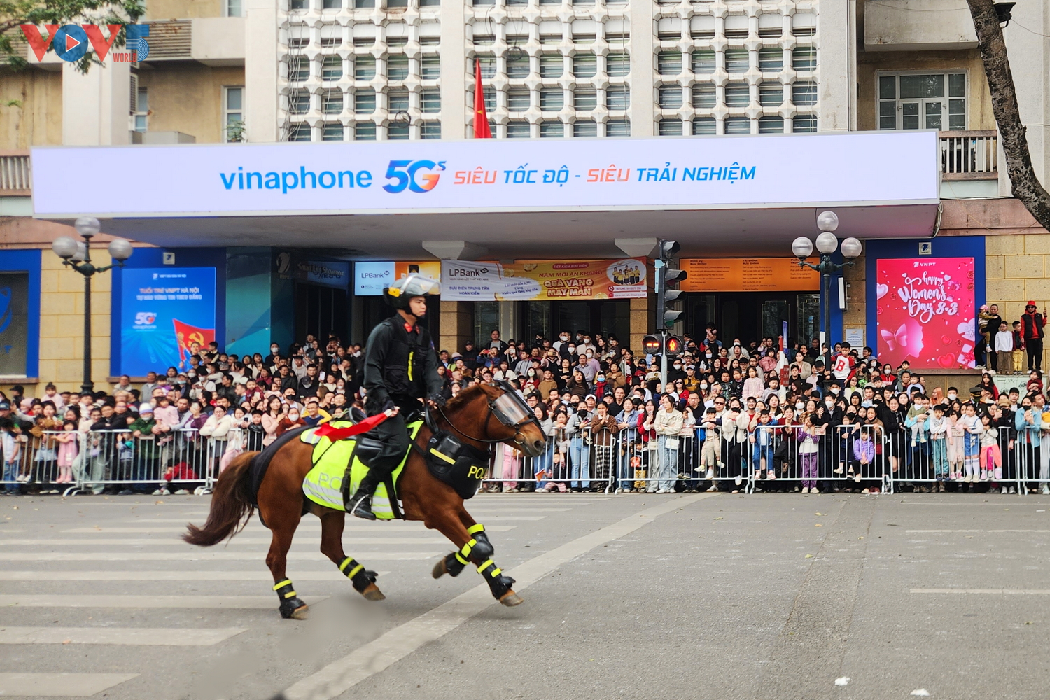 | Cảnh sát cơ động Kỵ binh trở lại phố đi bộ Hồ Gươm sau khi thu hút sự chú ý lớn trong buổi biểu diễn chiều 8/3. |