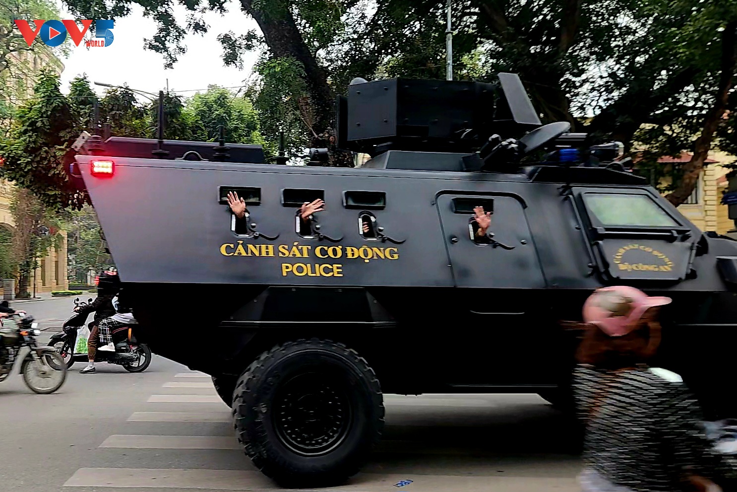 | Các chiến sĩ cảnh sát vẫy chào người dân khi trở về./. |