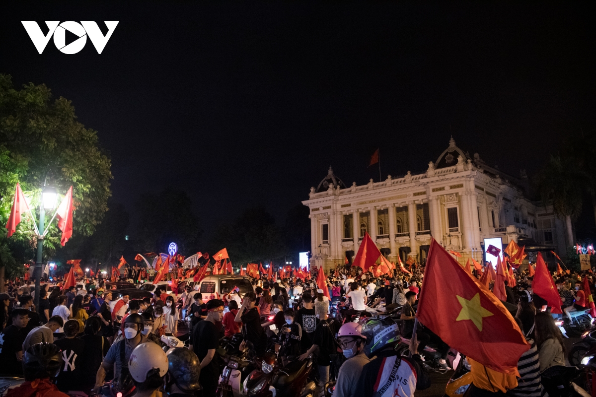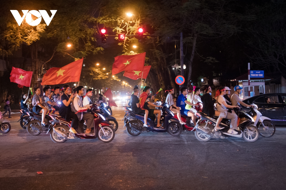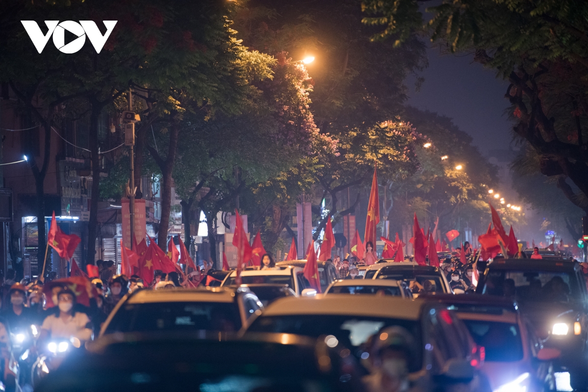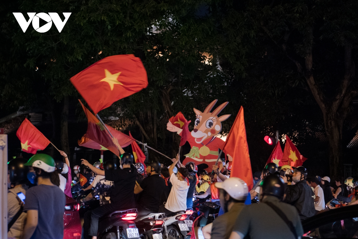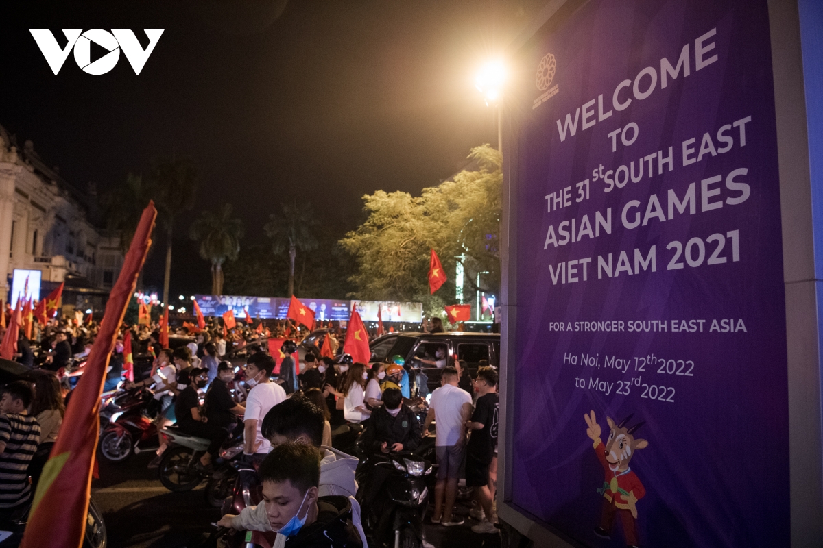 Theo ghi nhận của phóng viên VOV.VN, càng về khuya ngày 22/5, dòng người đổ về các tuyến phố trung tâm tại Hà Nội ngày càng đông để ăn mừng chiến thắng của đội tuyển bóng đá nam U23 tại SEA Games 31.