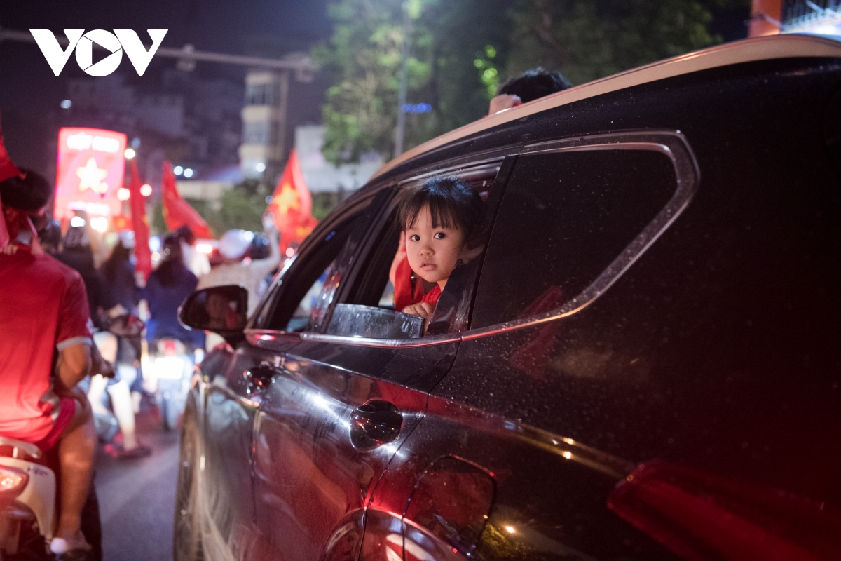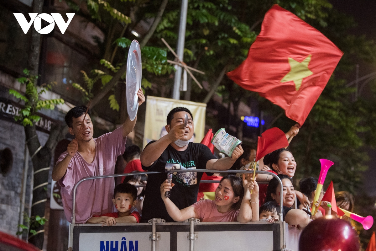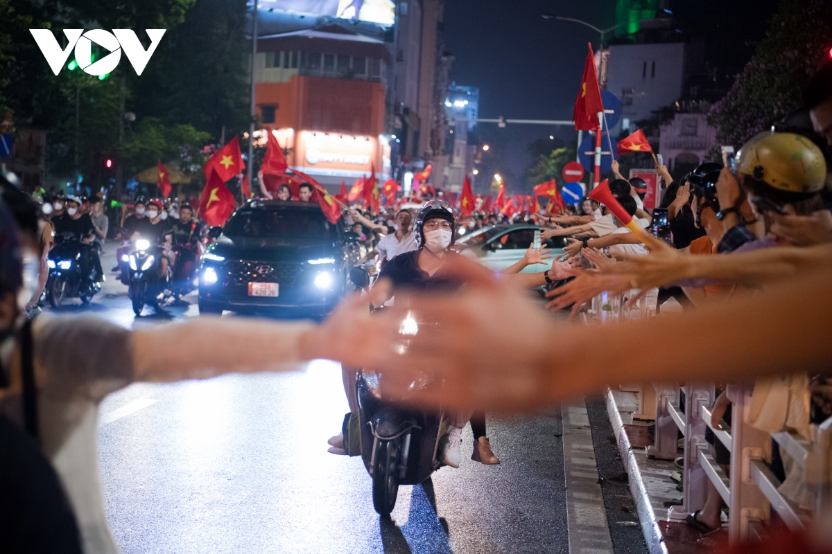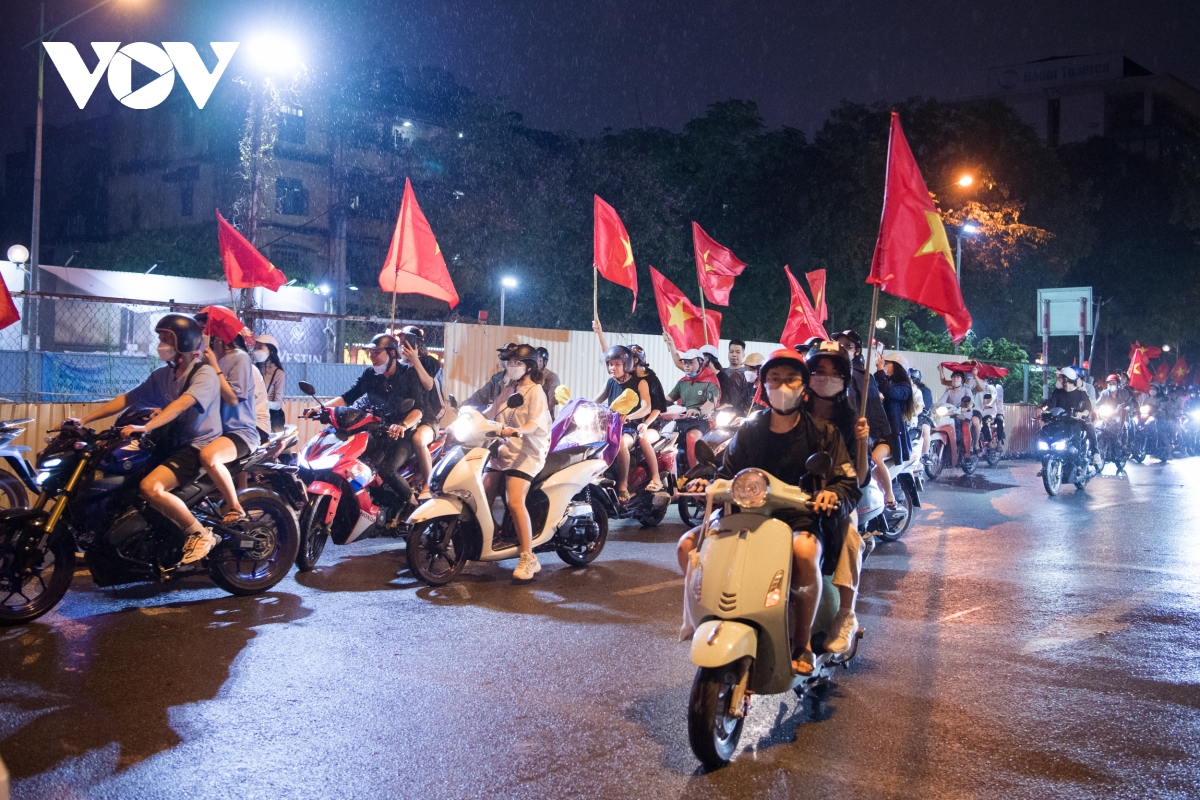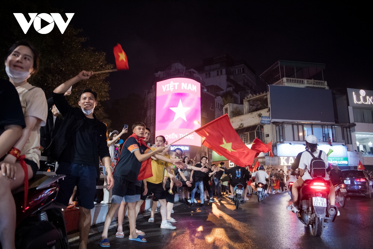 Theo ghi nhận của phóng viên VOV.VN, càng về khuya ngày 22/5, dòng người đổ về các tuyến phố trung tâm tại Hà Nội ngày càng đông để ăn mừng chiến thắng của đội tuyển bóng đá nam U23 tại SEA Games 31.