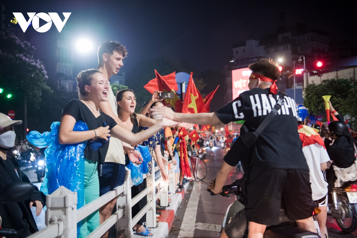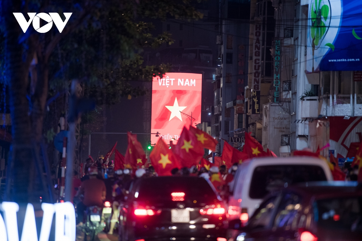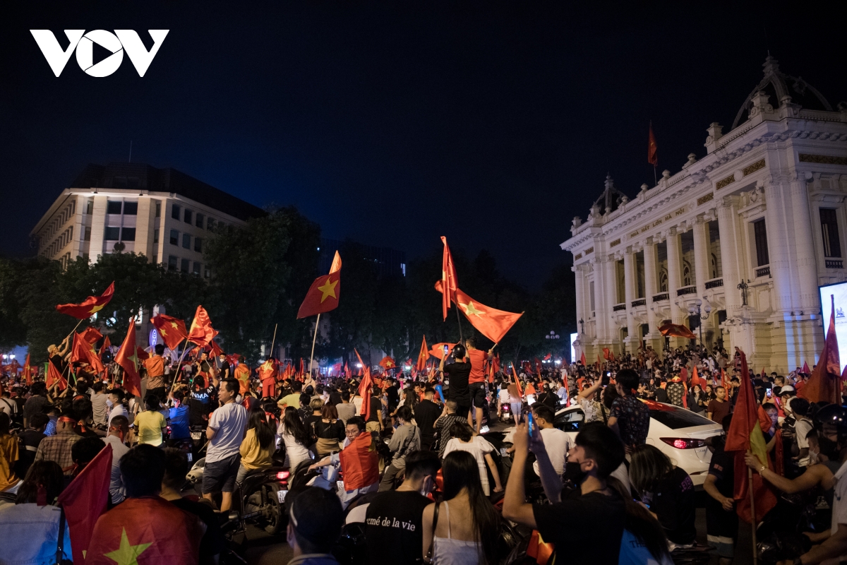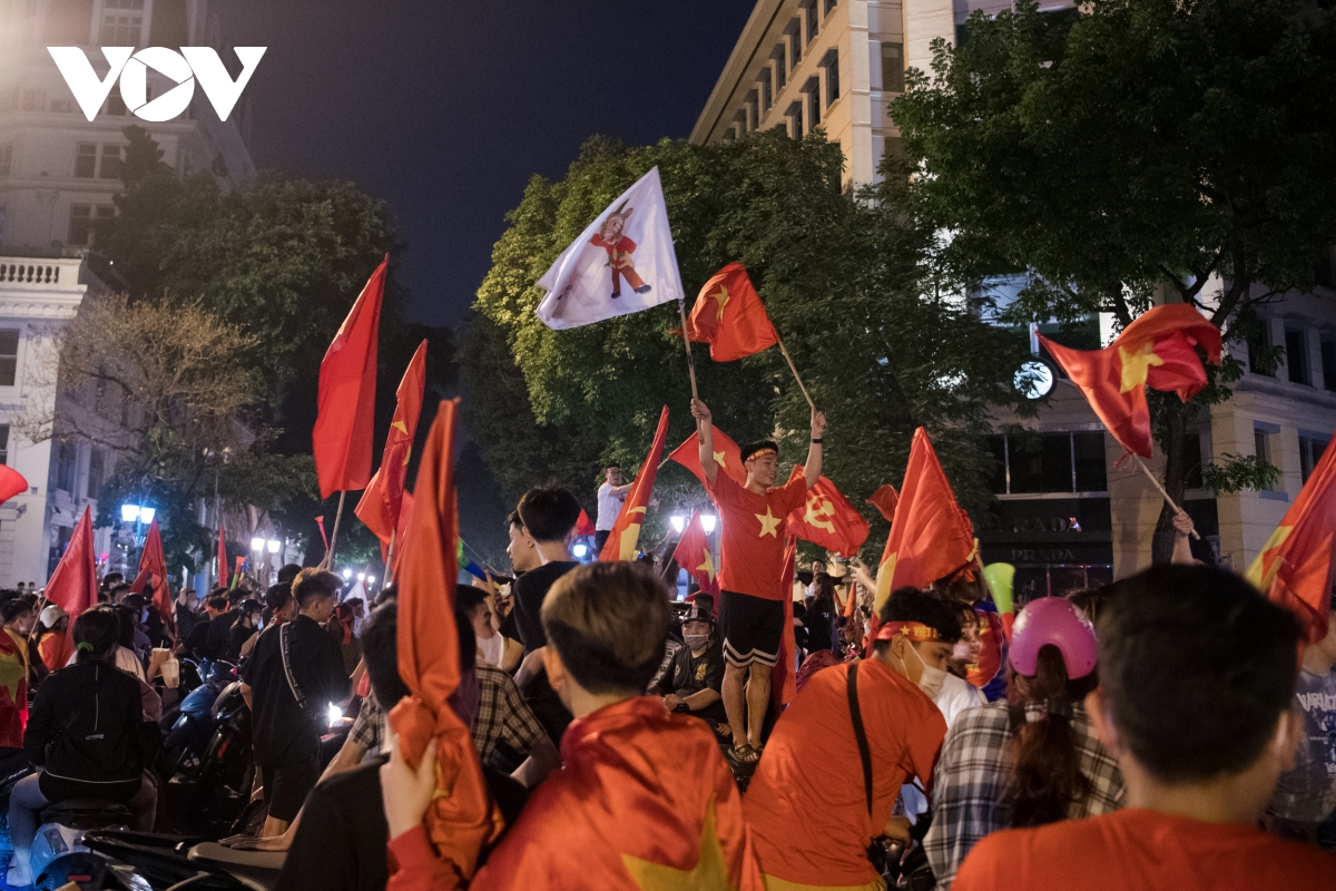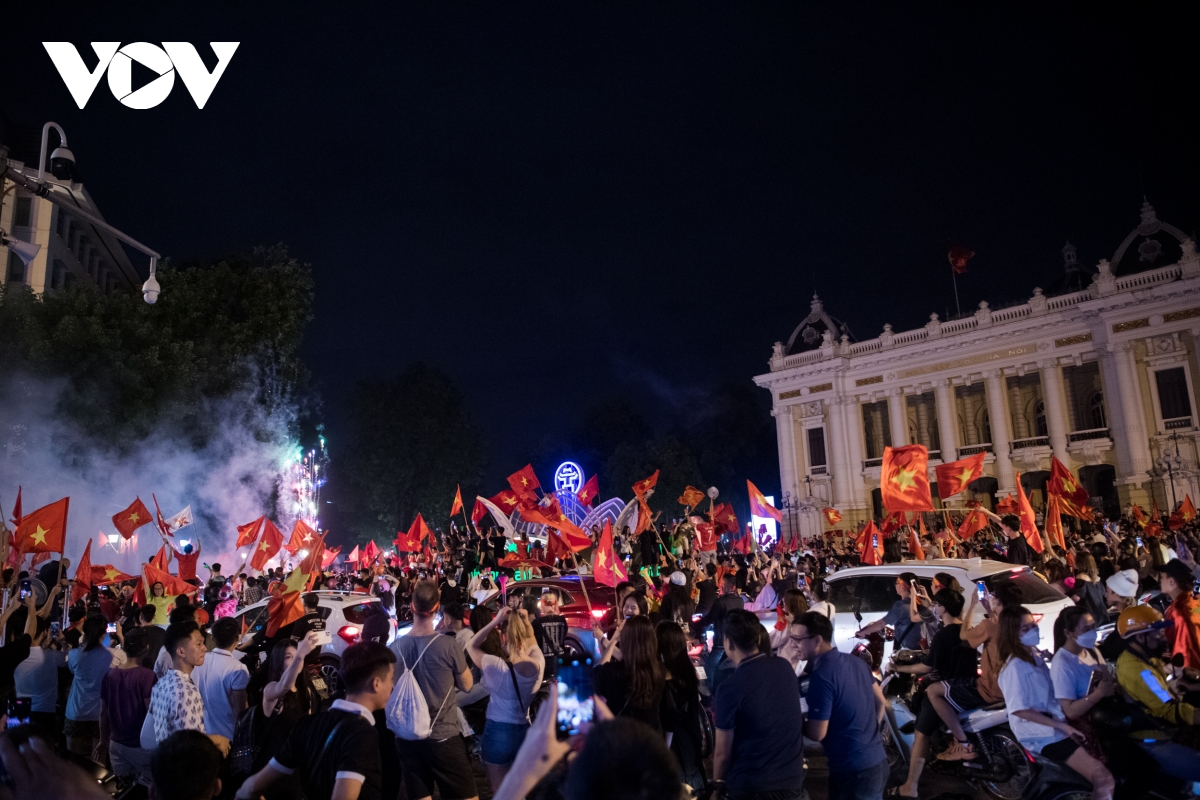 (VOV5) -Càng về khuya, dòng người càng đổ về các con phố trung tâm Hà Nội để ăn mừng chiến thắng của đội tuyển U23 Việt Nam tại trận chung kết bóng đá nam SEA Games 31.