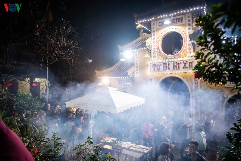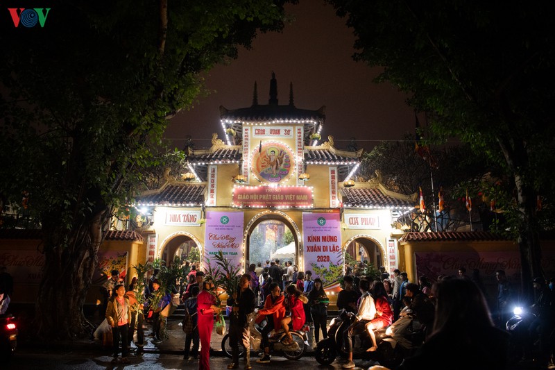 Sau thời khắc giao thừa, người dân Thủ đô cùng nhau tới chùa đầu năm thắp hương lễ Phật, hái lộc cầu chúc cho gia đình, bạn bè một năm mới nhiều hạnh phúc. Ảnh: Chùa Quán Sứ là một trong những chùa được nhiều người dân lui tới sau thời khắc giao thừa.