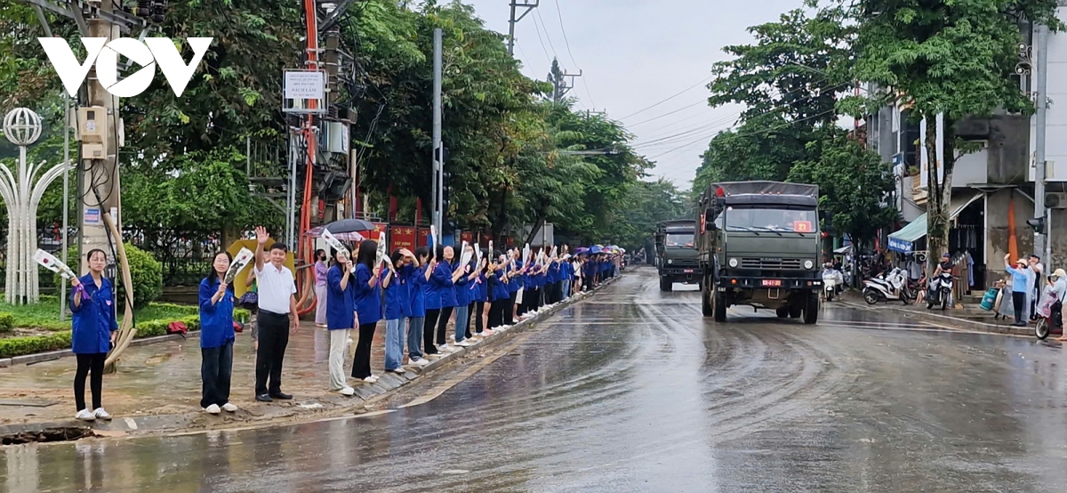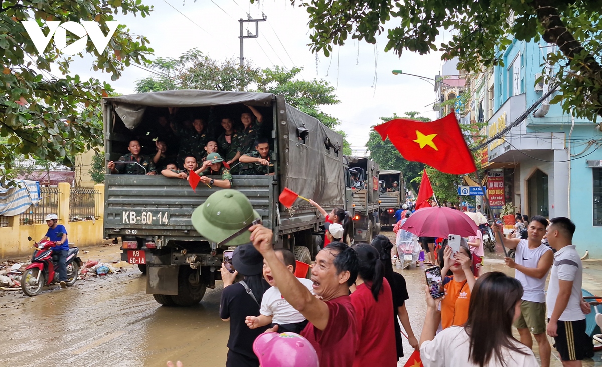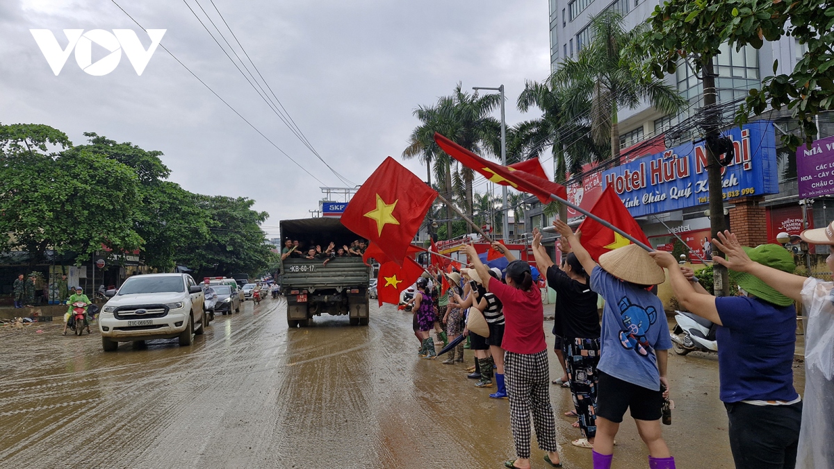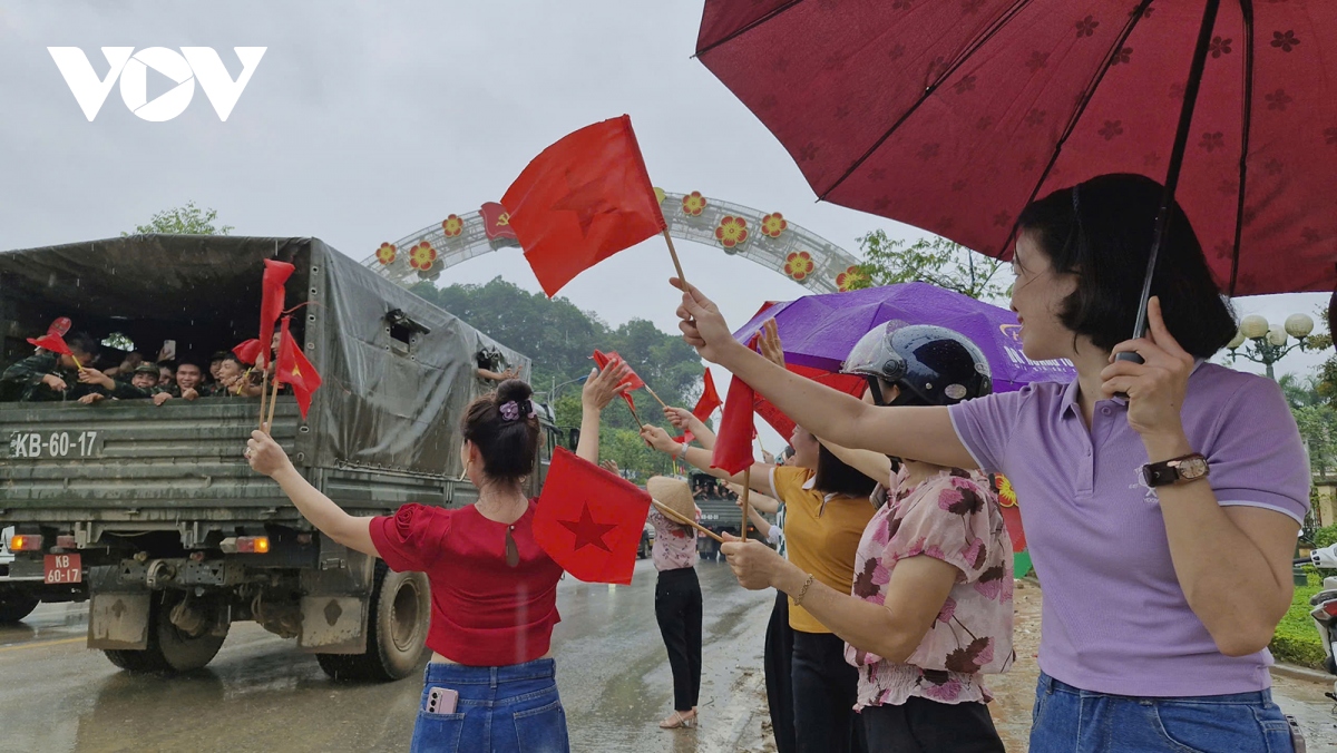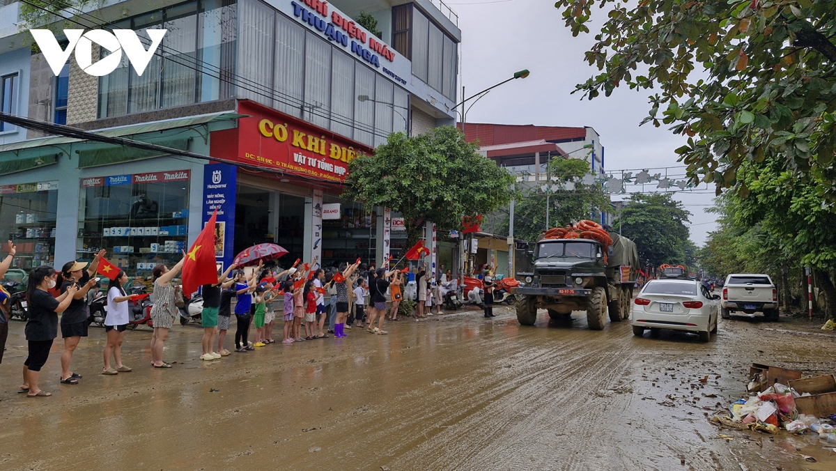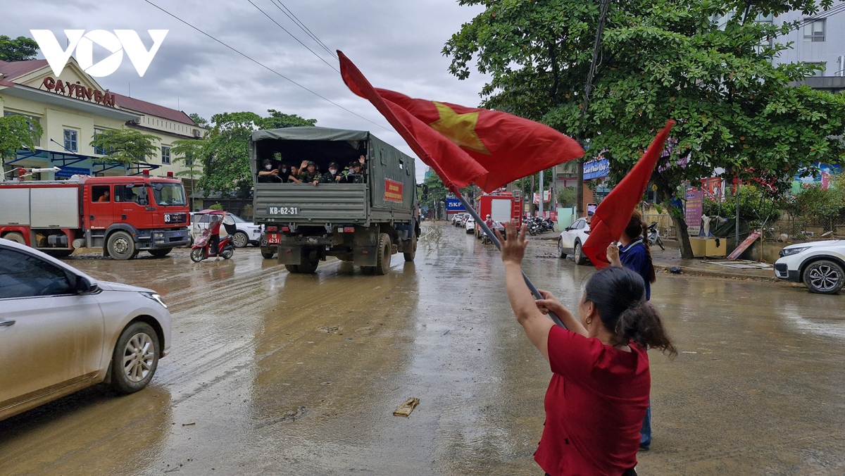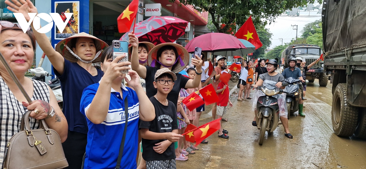 Người dân đứng dọc hai bên đường đoàn xe Bộ đội đi qua đều mang theo cờ Tổ quốc, cờ Đảng vẫy chào, lòng thêm cảm phục những người lính không quản ngại vất vả vì dân. Họ chính là động lực, là điểm tựa để nhân dân vùng lũ tiếp tục khắc phục khó khăn, sớm ổn định đời sống.