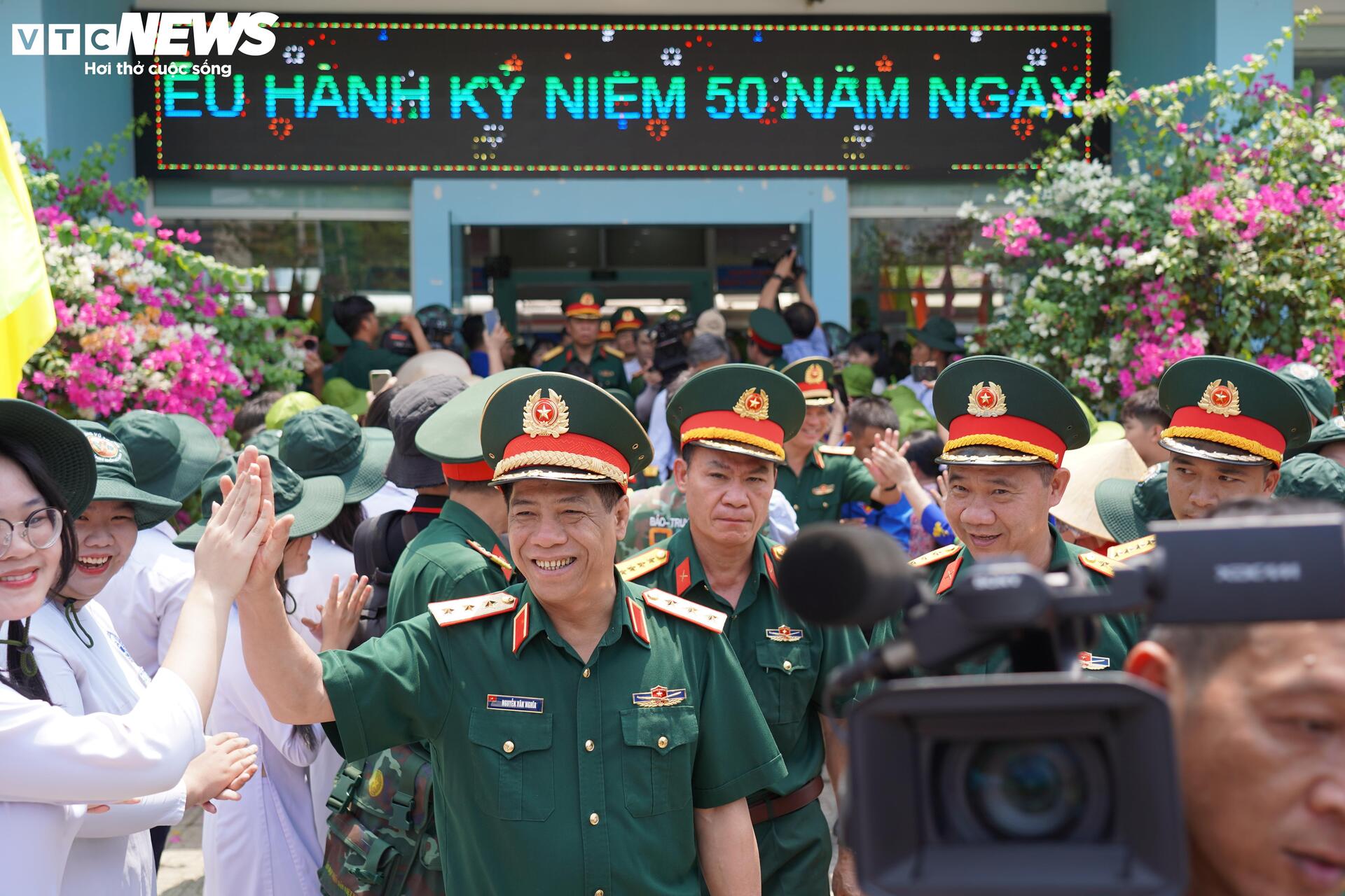 | Người dân đội nắng, có mặt từ sớm để đón các cán bộ, chiến sĩ từ Bắc vào. Thượng tướng Nguyễn Văn Nghĩa, Phó Tổng tham mưu trưởng Quân đội Nhân dân Việt Nam và đoàn công tác nhận được sự đón tiếp nồng nhiệt từ người dân địa phương. |
