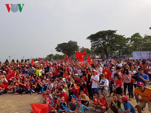 | Người hâm mộ cổ vũ cho U23 Việt Nam tại Lào. (Ảnh: Mỹ Bình). |