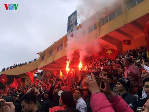 | Hàng loạt tiếng reo hò cổ vũ tại sân Hàng Đẫy, Hà Nội sau siêu phẩm đá phạt của Quang Hải. (Ảnh: Vũ Toàn). |