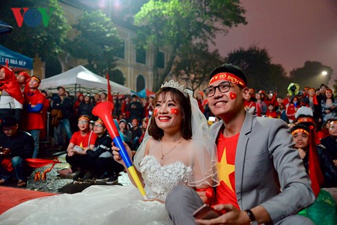 | Cô dâu - Chú rể tại một điểm xem U23 Việt Nam tại hồ Hoàn Kiếm, Hà Nội. (Ảnh: Trường Giang). |