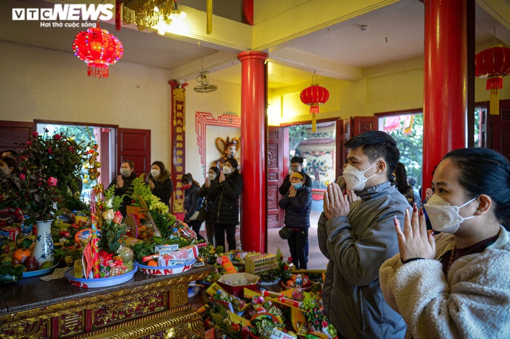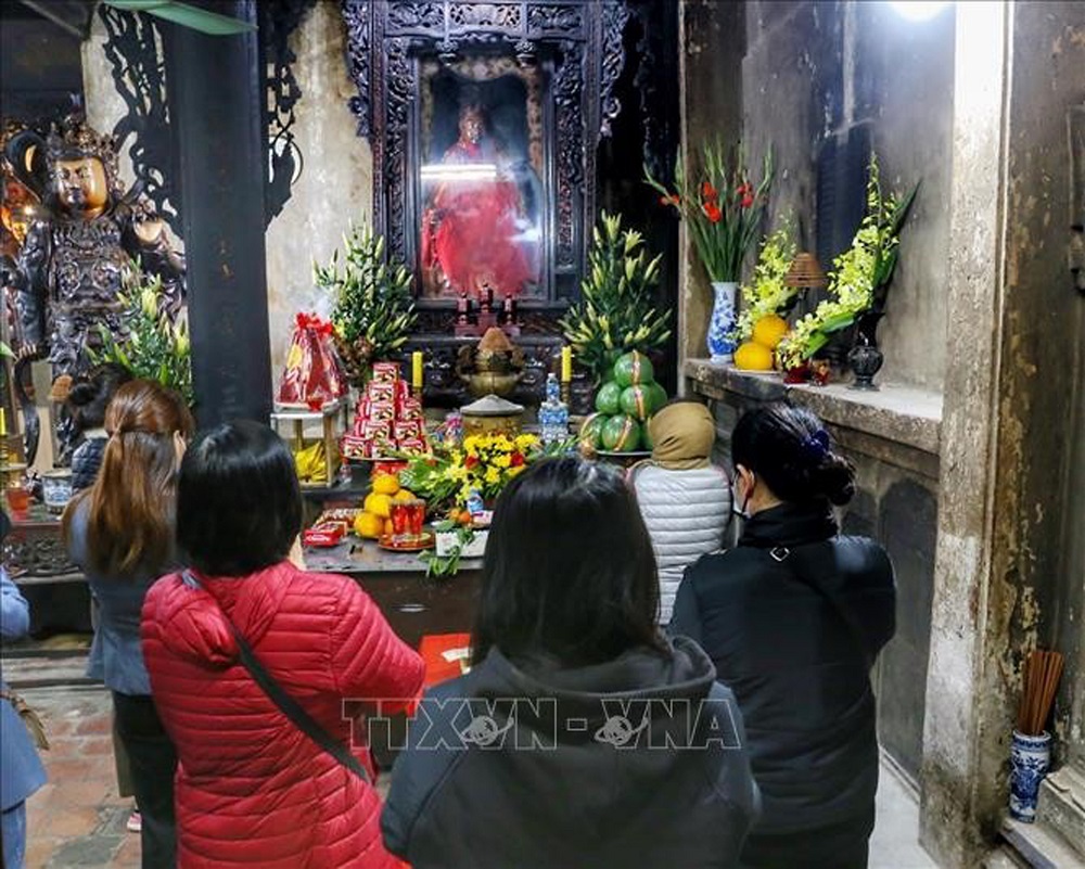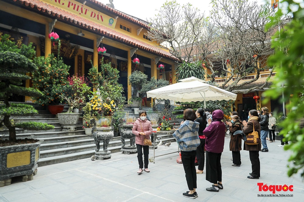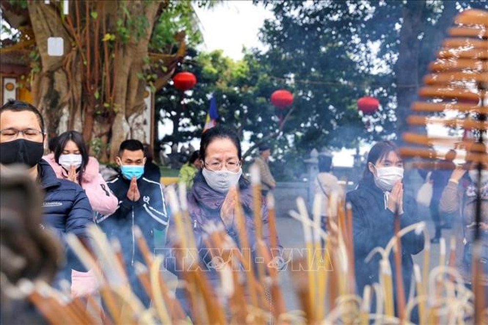 Người dân đi chùa cầu bình an, may mắn tại chùa Phúc Khánh, quận Đống Đa, Hà Nội. Ảnh: Tuấn Đức/ TTXVN |