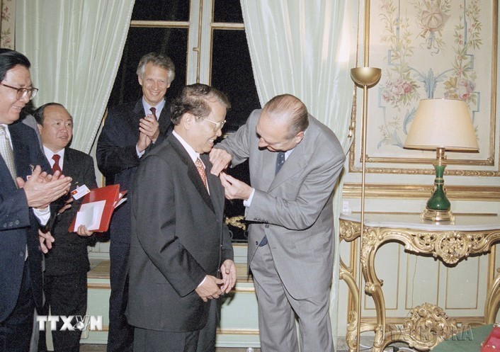 Tổng thống Pháp Jacques Chirac trao tặng Huân chương Bắc Đẩu bội tinh hạng Nhất cho Chủ tịch nước Trần Đức Lương (Paris, 28/10/2002). Ảnh: Nguyễn Khang/TTXVN |