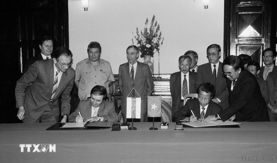 Phó Chủ tịch Hội đồng Bộ trưởng Trần Đức Lương và Phó Chủ tịch Hội đồng Bộ trưởng Nikolay Kostikov ký Hiệp định hợp tác Việt Nam-Belarus (Hà Nội, 19/3/1992). Ảnh: Xuân Tuân/TTXVN |