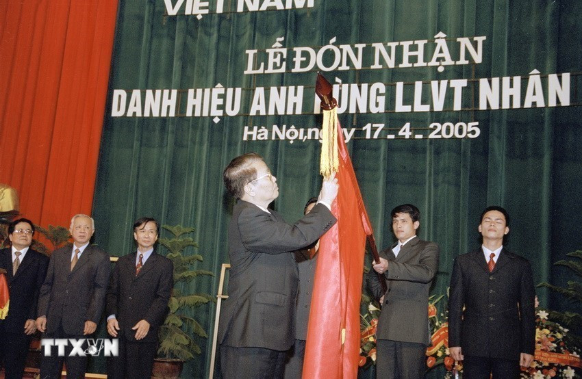 Chủ tịch nước Trần Đức Lương gắn huy hiệu Anh hùng Lực lượng vũ trang nhân dân lên lá cờ truyền thống của Thông tấn xã Việt Nam, ngày 17/4/2005. Ảnh: Nguyễn Khang/TTXVN |