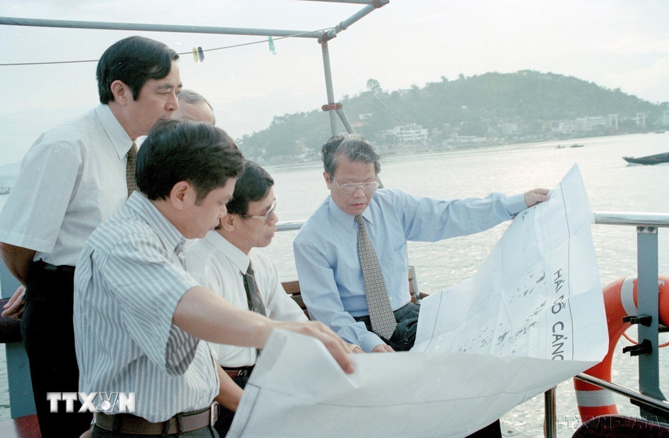 Chủ tịch nước Trần Đức Lương kiểm tra quy hoạch Vịnh Hạ Long, nhằm đảm bảo phát triển kinh tế và bảo vệ cảnh quan môi trường (15/10/1997). Ảnh: Trọng Nghiệp/TTXVN |