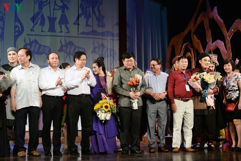 PGS.TS Nguyễn Thế Kỷ tặng hoa các nghệ sĩ. Sau khi tham gia Liên hoan quốc tế sân khấu thử nghiệm lần thứ 4, “Ngàn năm mây trắng” tiếp tục công diễn phục vụ công chúng ở Nhà hát VOV, Nhà hát Lớn Hà Nội, trên các kênh sóng phát thanh, truyền hình của VOV, một số đài phát thanh, truyền hình và một số địa phương trong cả nước./.