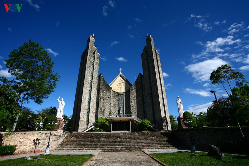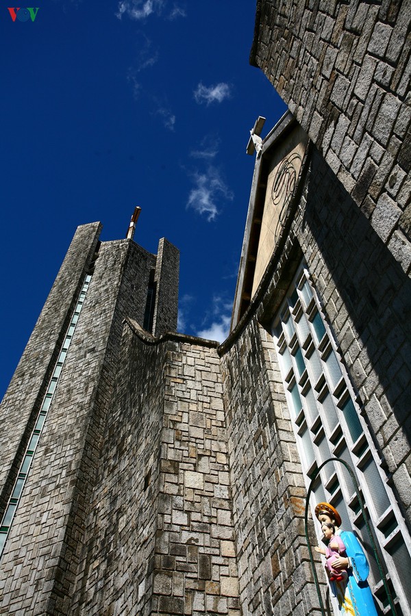 Cùng với hệ kết cấu bê tông cốt thép là các vật liệu truyền thống như đá, gỗ, ngói đất nung. Công trình có hình khối mạnh mẽ của kiến trúc hiện đại nhưng vẫn đậm dấu ấn bản địa. Cửa sổ tường biên nhà thờ được tổ hợp từ những vòm cuốn cùng cây thánh giá.